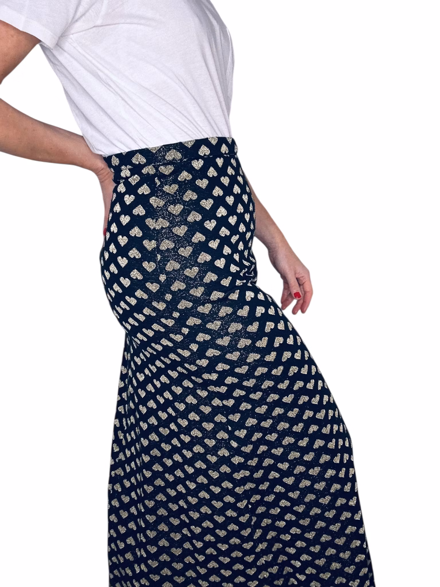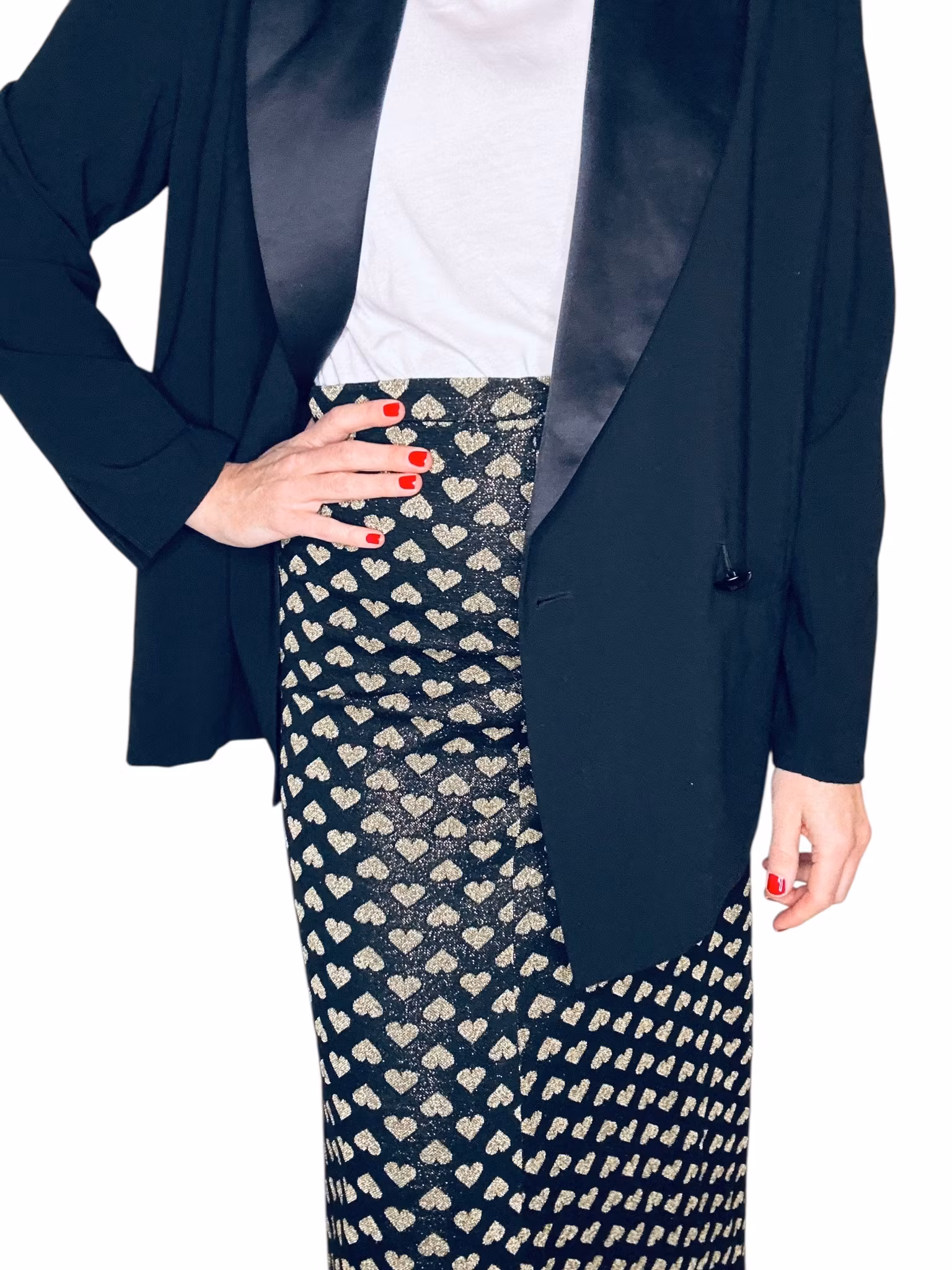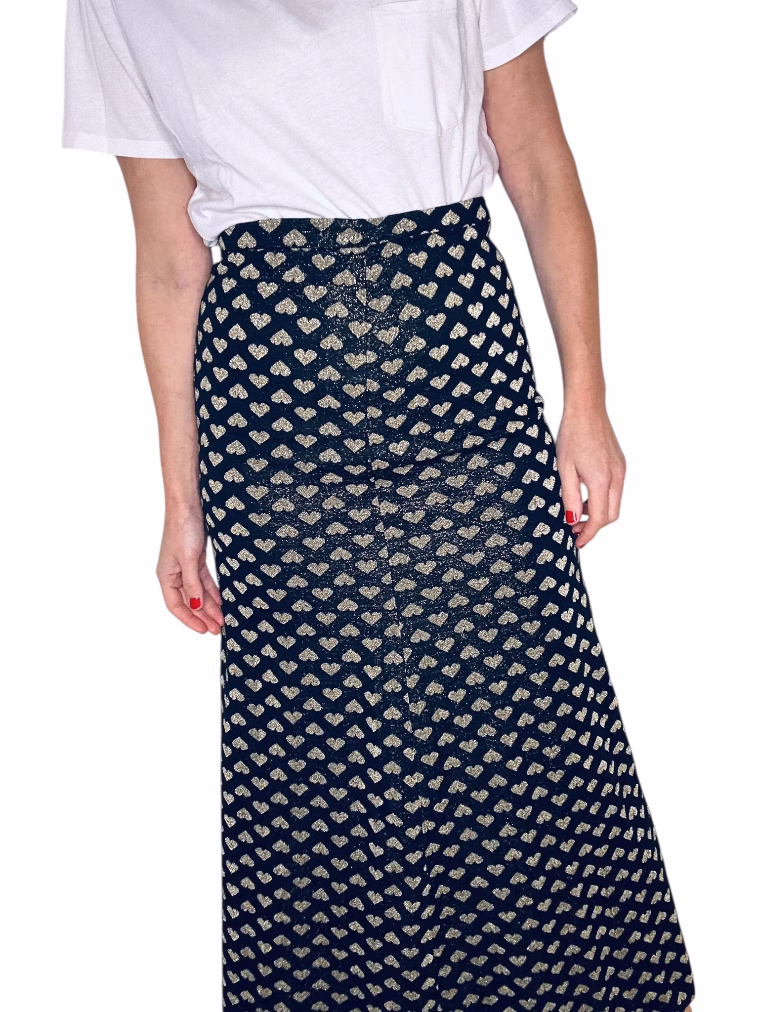 Beskrivning: Vintage kjol från 70-talet. Lång och lätt utställd. Svart med vävda hjärtan i guldfärg. Material saknas men uppskattas vara polyester och lurex. Stängs med dragkedja och knapp.