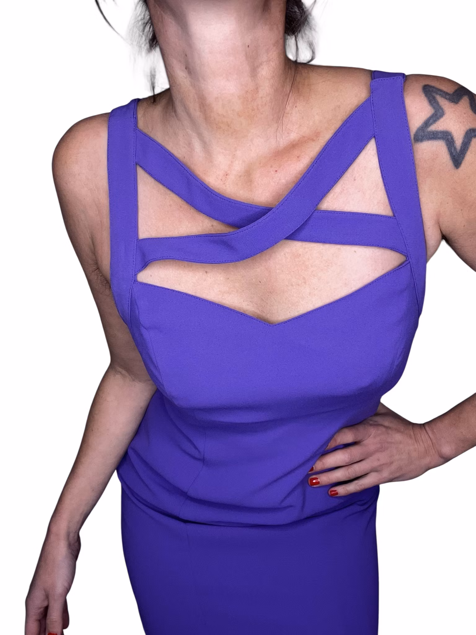 Beskrivning: Vackert lila klänning med figurnära form och en slits framtill. Band som går i kors både över bröst och rygg - väldigt Thierry Mugler. Stängs med dragkejda och hyskor i sidan. Fodrad. Från Frank Usher.