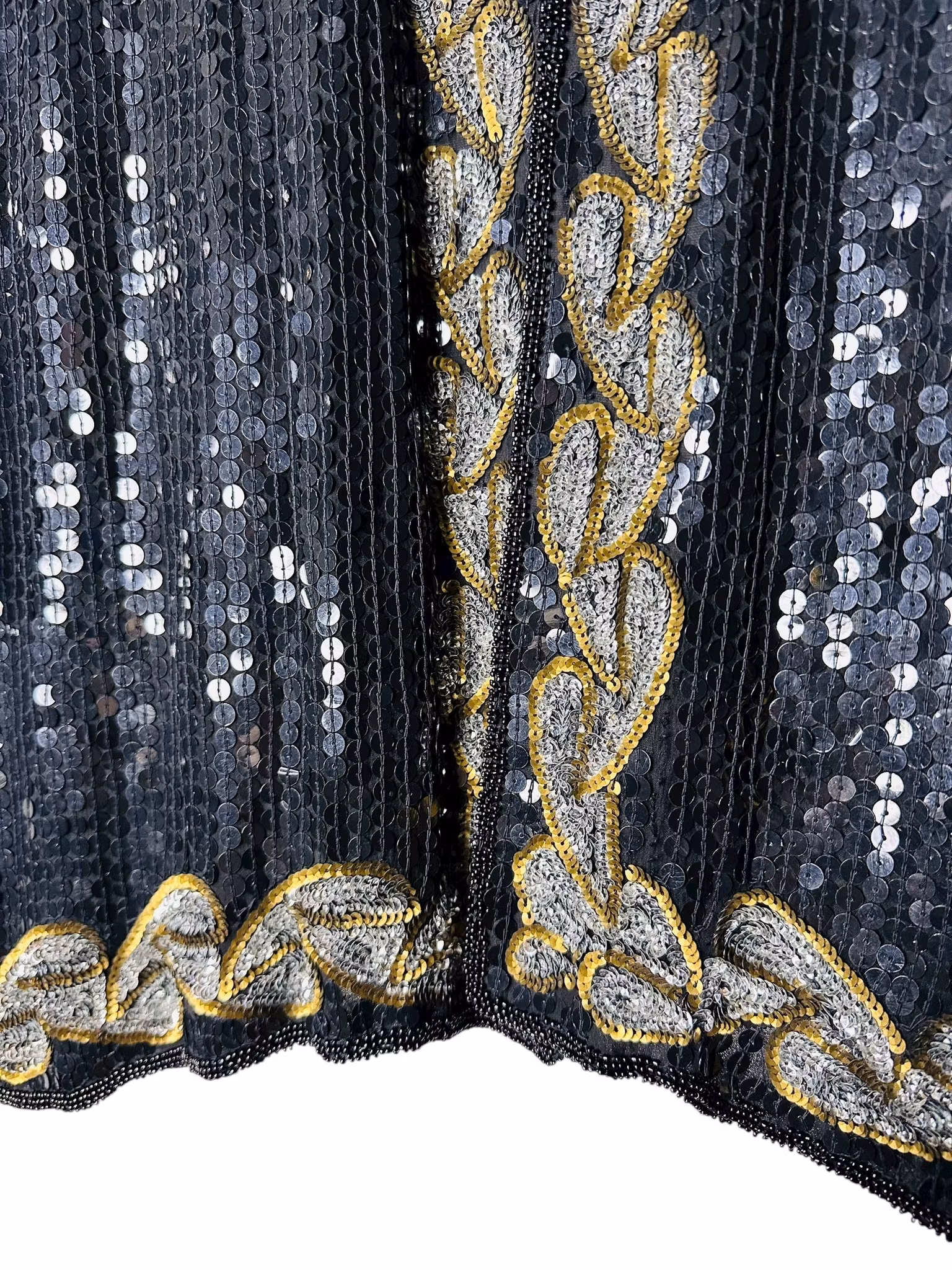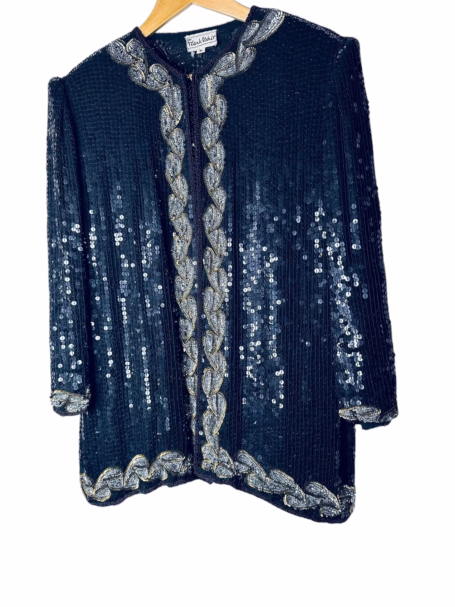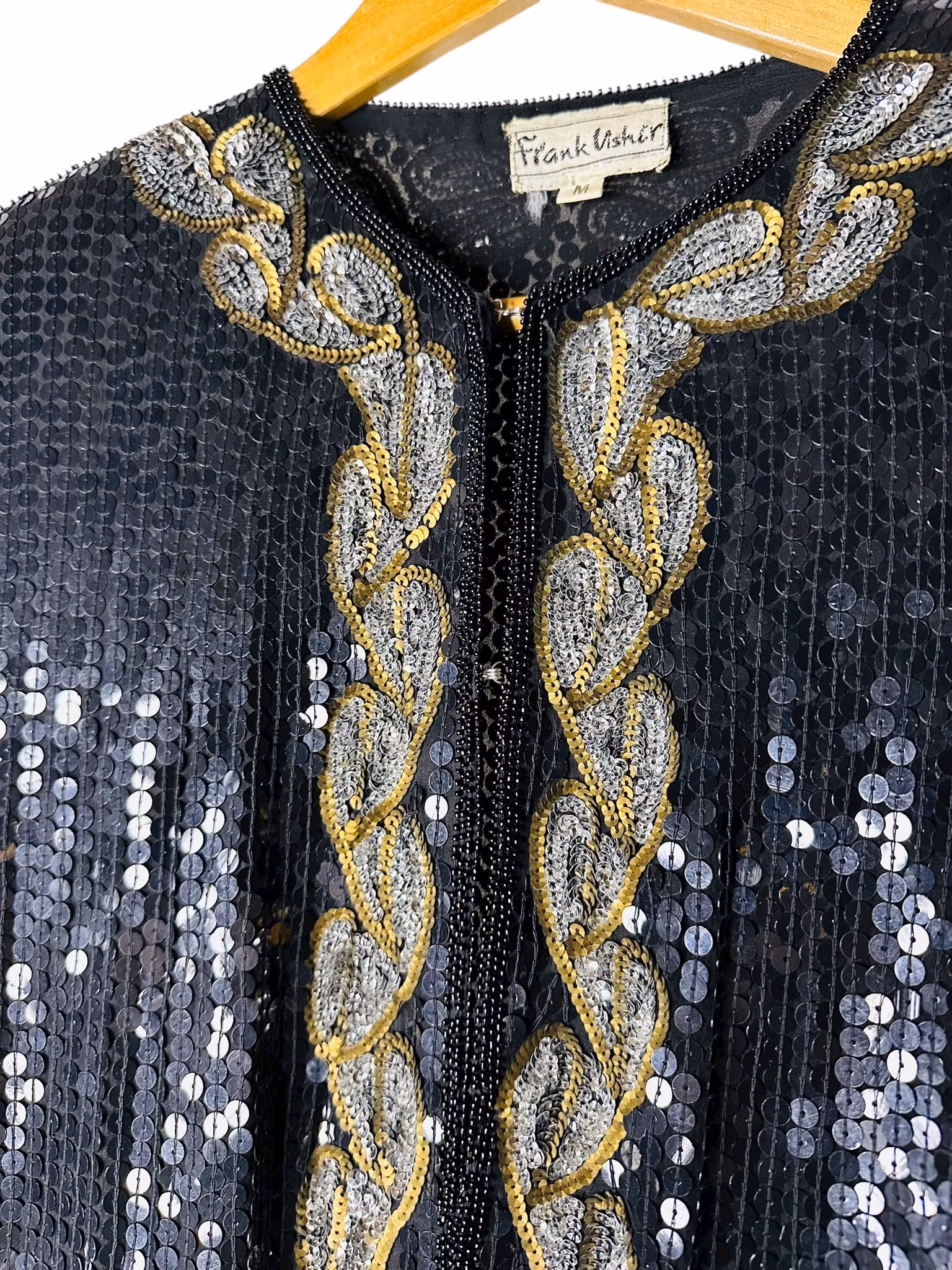 Beskrivning: En smått otrolig vintage paljettjacka från Frank Usher. Märket som tog catwalken till gatan genom att erbjuda extravaganta festkläder till överkomliga priser. Denna jacka är i siden med foder i viskos och har markerade, uppbyggda, spetsiga axlar som verkligen ger den sin speciella, kaxiga form. Kantad med paljetter i guld och silver och alla sömmar är täckta med små svarta pärlor. Kan stängas med två hyskor framtill.