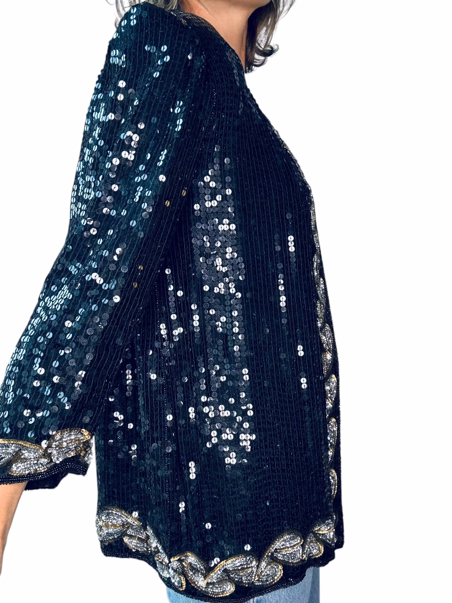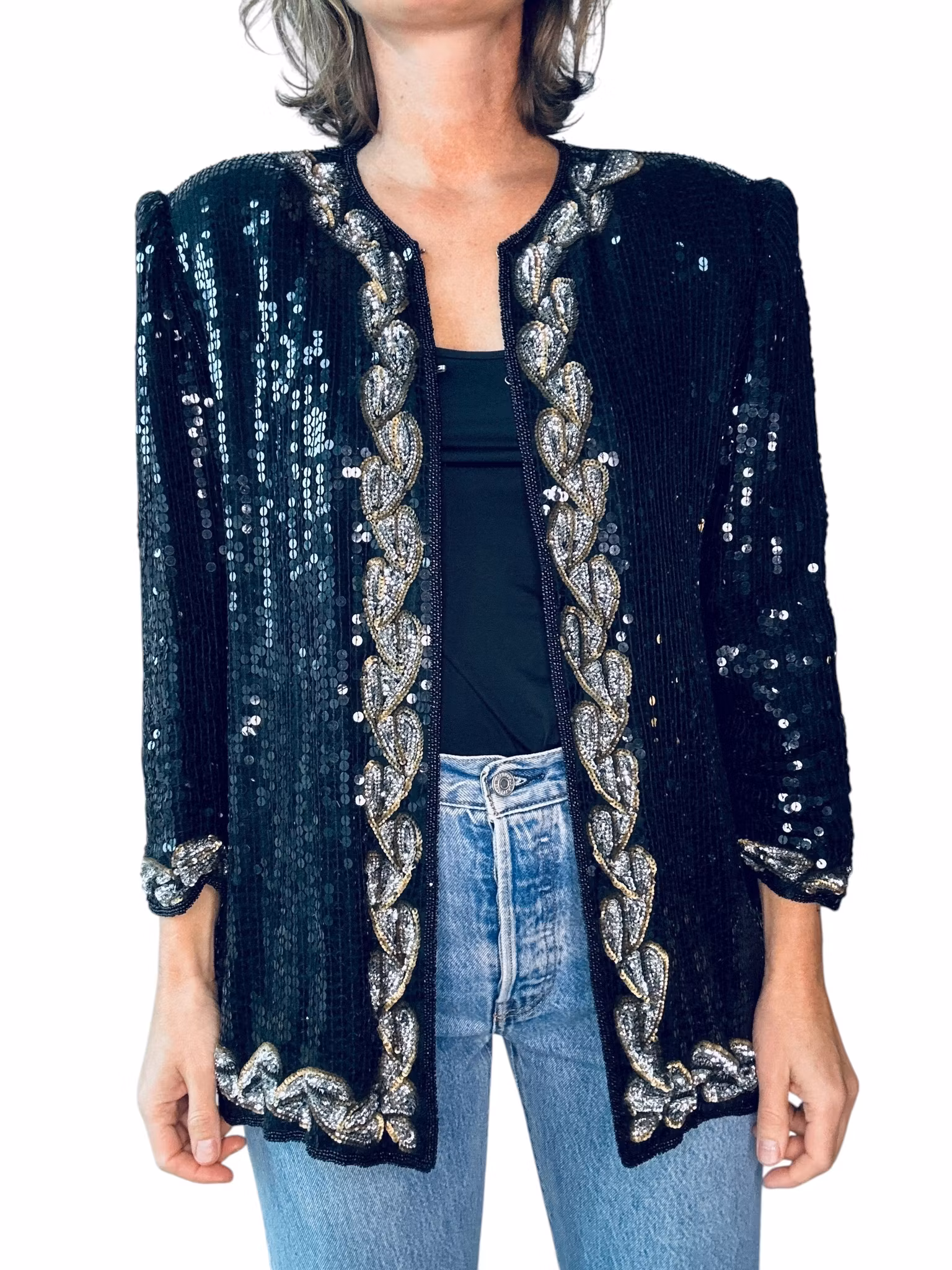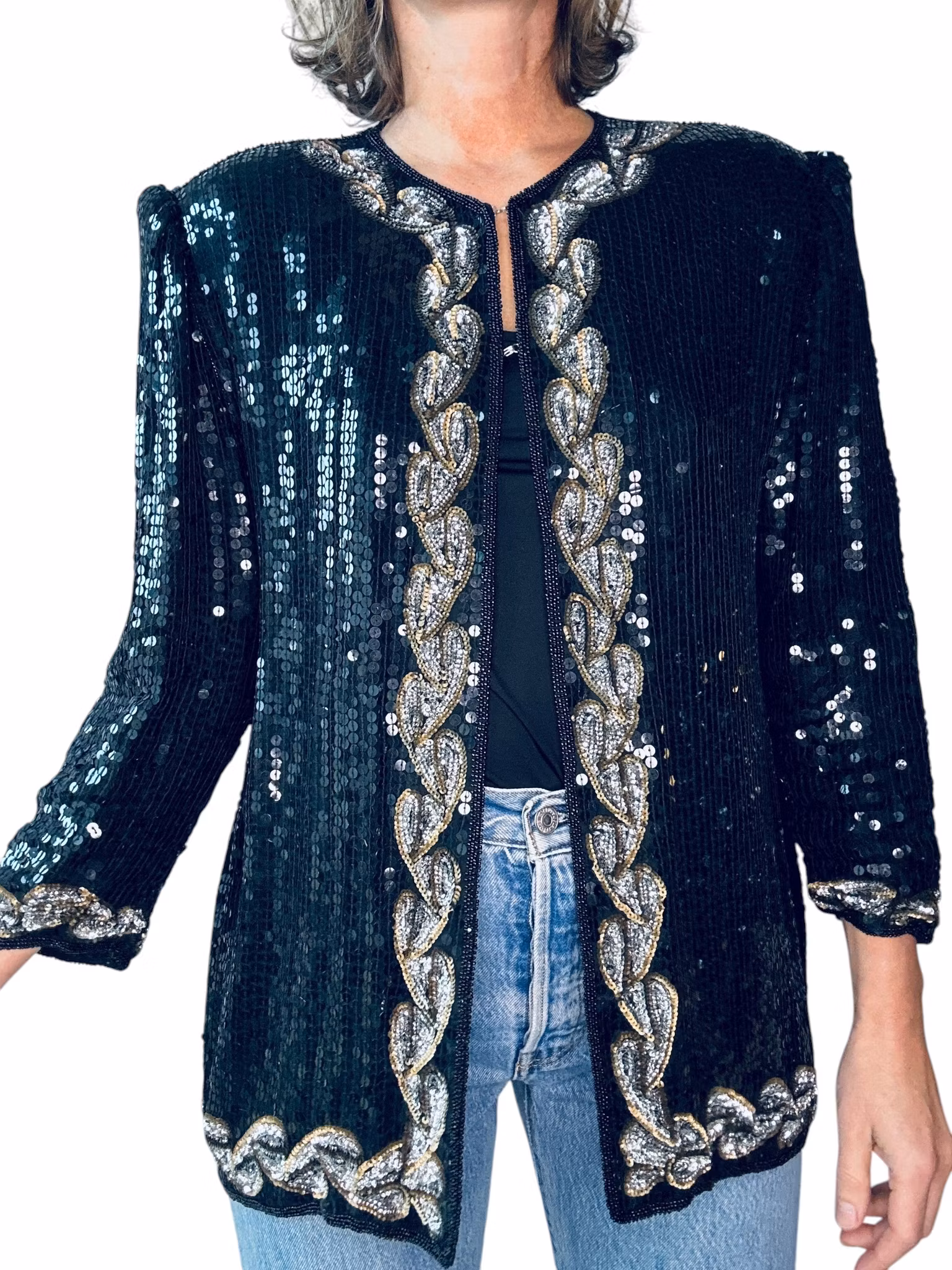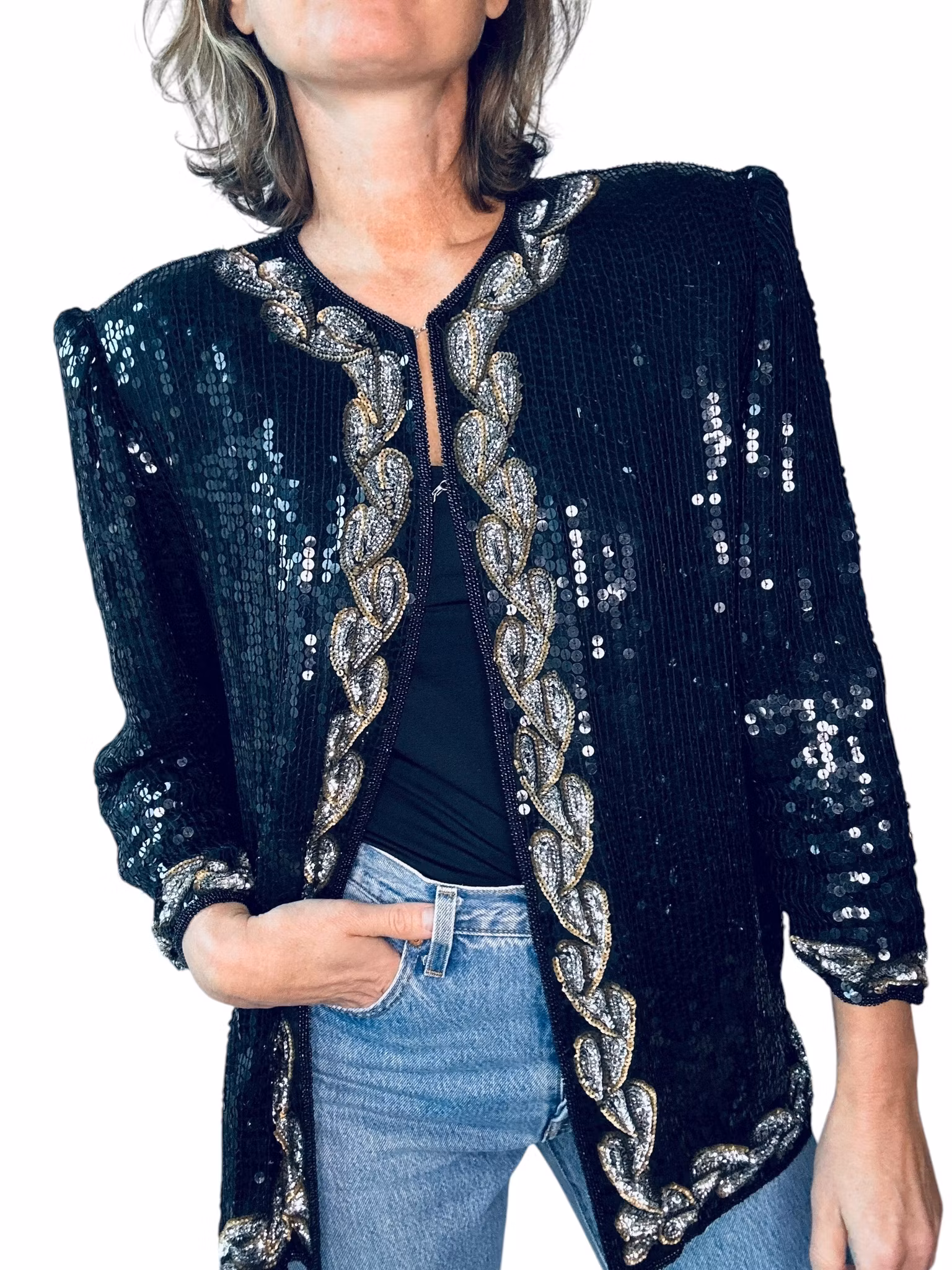 Beskrivning: En smått otrolig vintage paljettjacka från Frank Usher. Märket som tog catwalken till gatan genom att erbjuda extravaganta festkläder till överkomliga priser. Denna jacka är i siden med foder i viskos och har markerade, uppbyggda, spetsiga axlar som verkligen ger den sin speciella, kaxiga form. Kantad med paljetter i guld och silver och alla sömmar är täckta med små svarta pärlor. Kan stängas med två hyskor framtill.