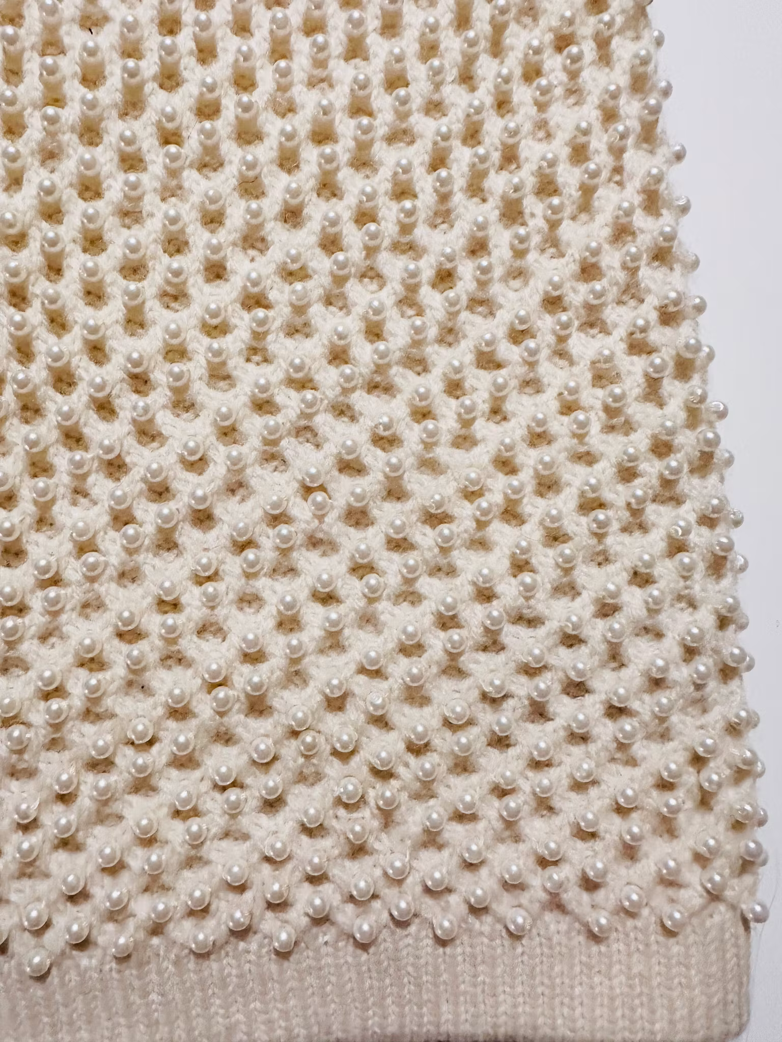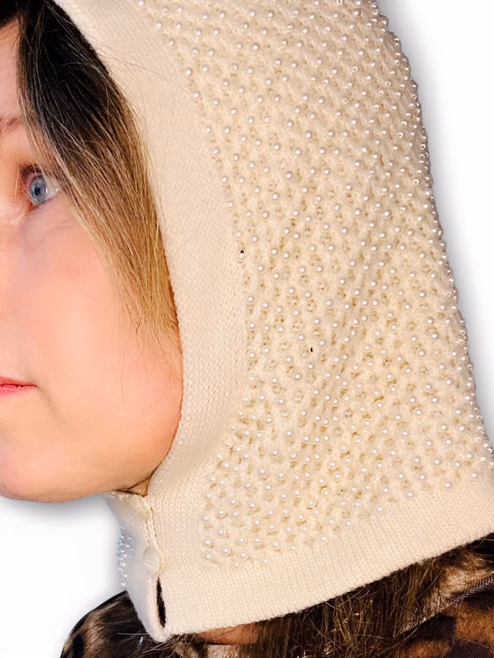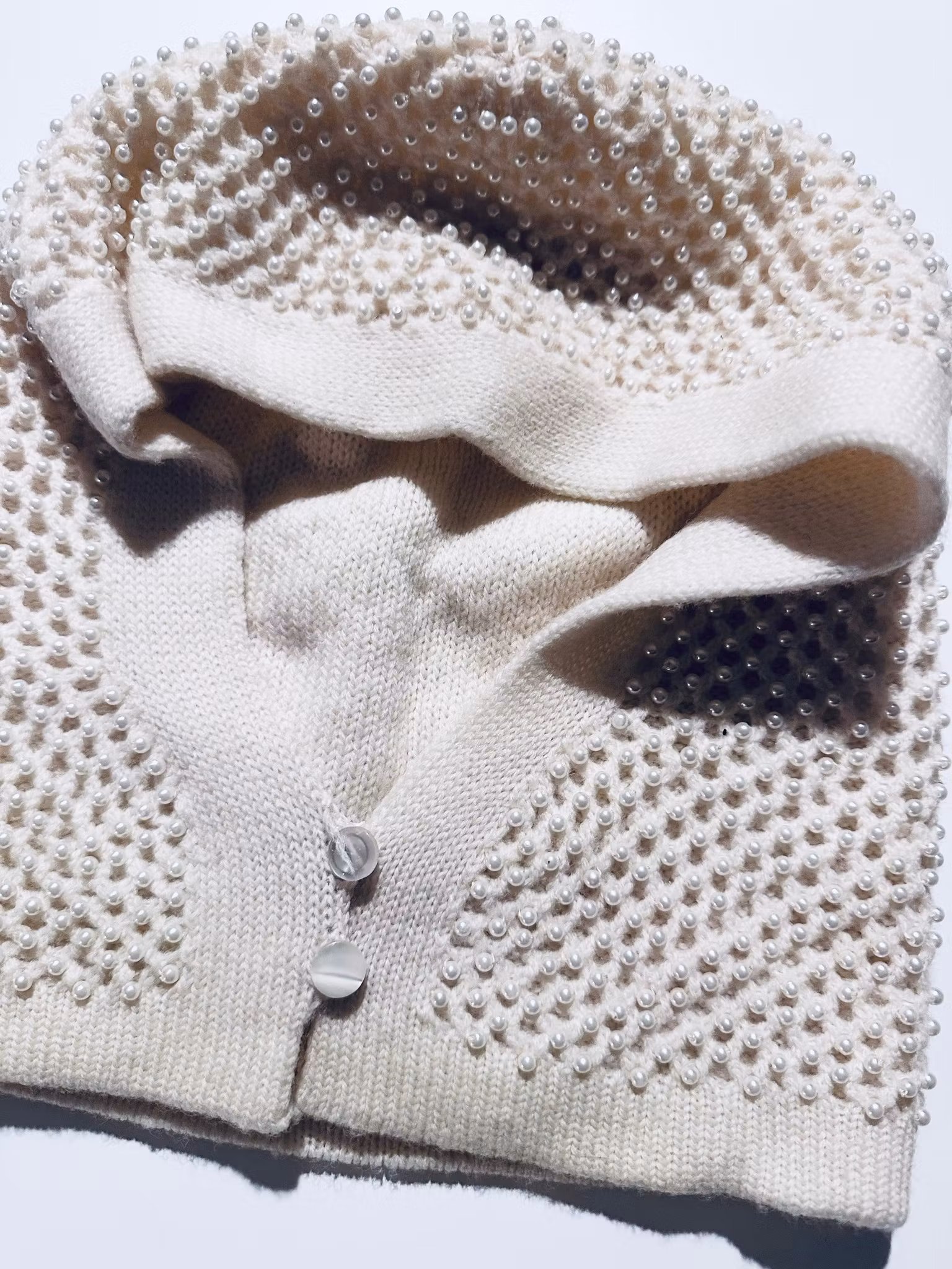 Beskrivning: Vintage och smått otrolig balaklava i 100% dubbel ull. Det understa vanligt stickat, det översta strukturstickat med hål och ett tätt pärltäcke. Stängs med två pärlemorknappar under hakan. I cremevitt och märkt "Beauty" i guldbokstäver! Känns väldigt Chanelig och är sannolikt 60-tal.