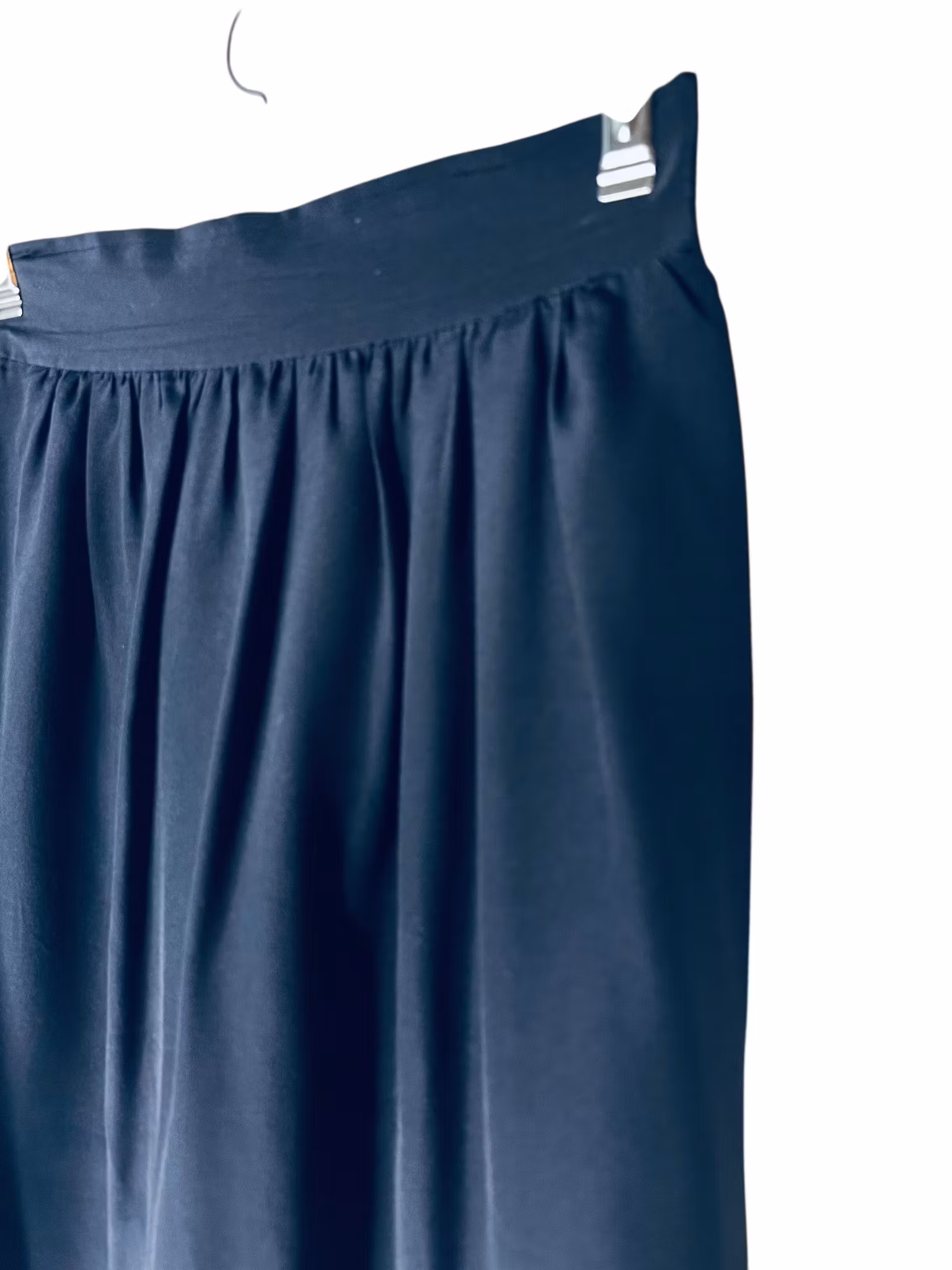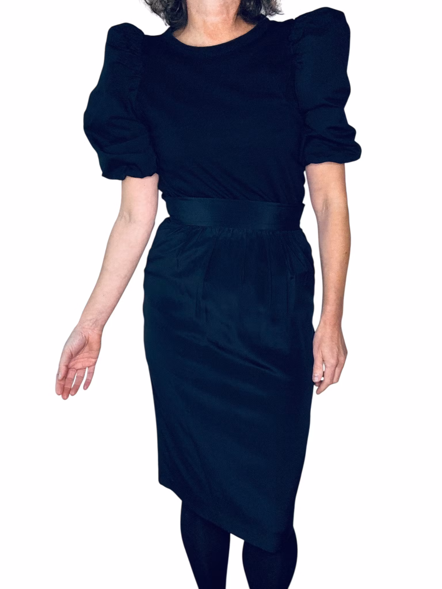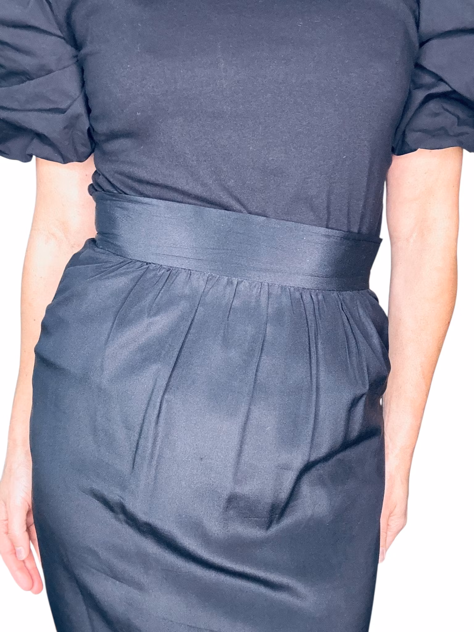 Beskrivning: En vintage pennkjol i tunn, svart siden. Helfodrad med bred linning och stängning i ryggen med knapp och dragkedja. Från Contraste par Christine Bergseije. OBS att modellen på bild inte kan knäppa kjolen ända upp i ryggen.