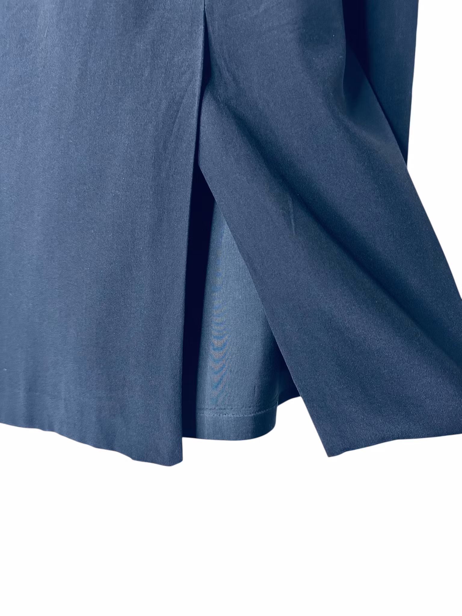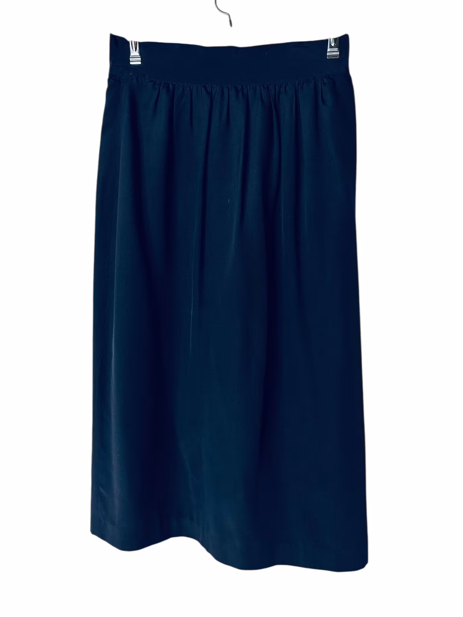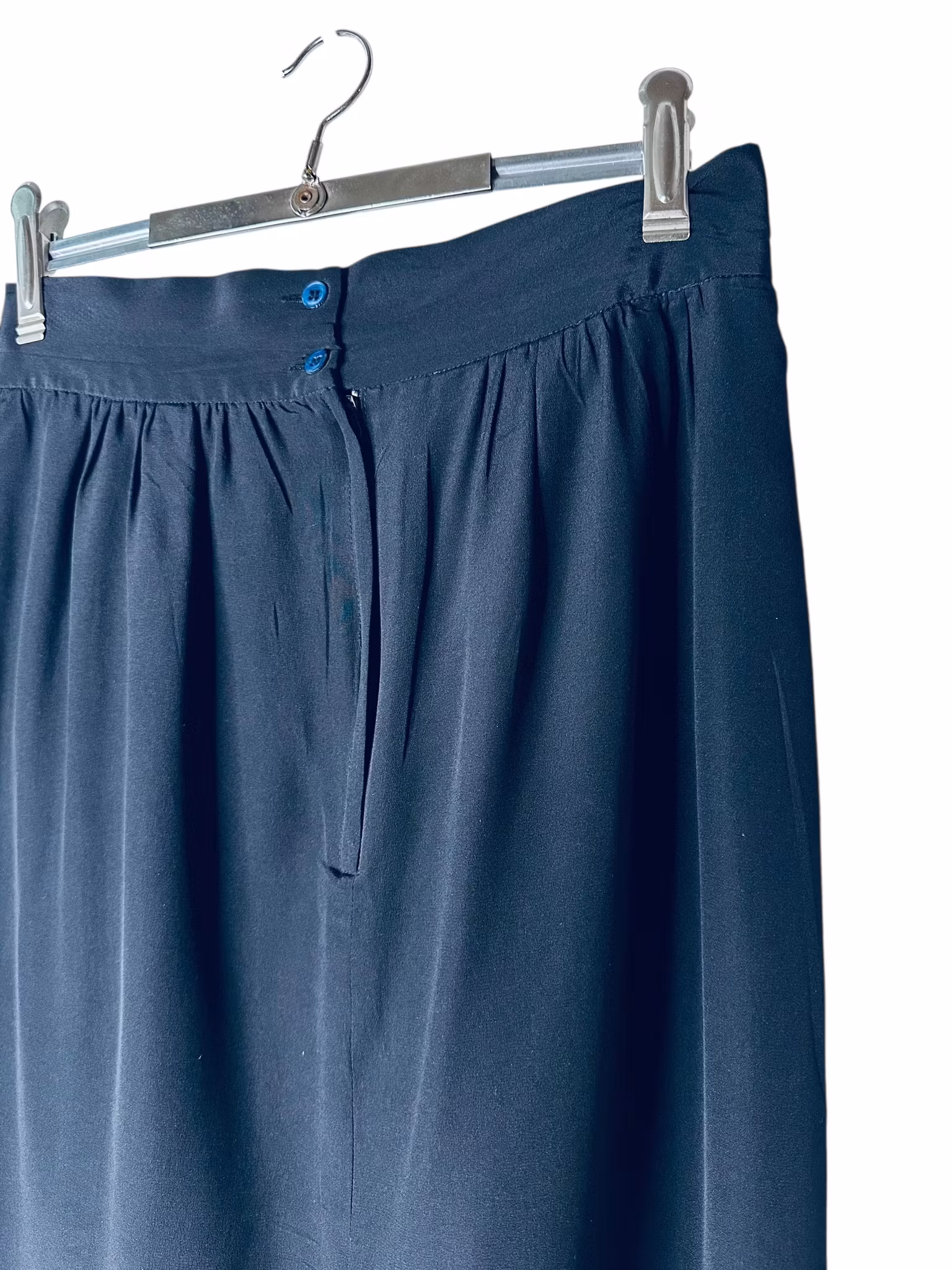 Beskrivning: En vintage pennkjol i tunn, svart siden. Helfodrad med bred linning och stängning i ryggen med knapp och dragkedja. Från Contraste par Christine Bergseije. OBS att modellen på bild inte kan knäppa kjolen ända upp i ryggen.