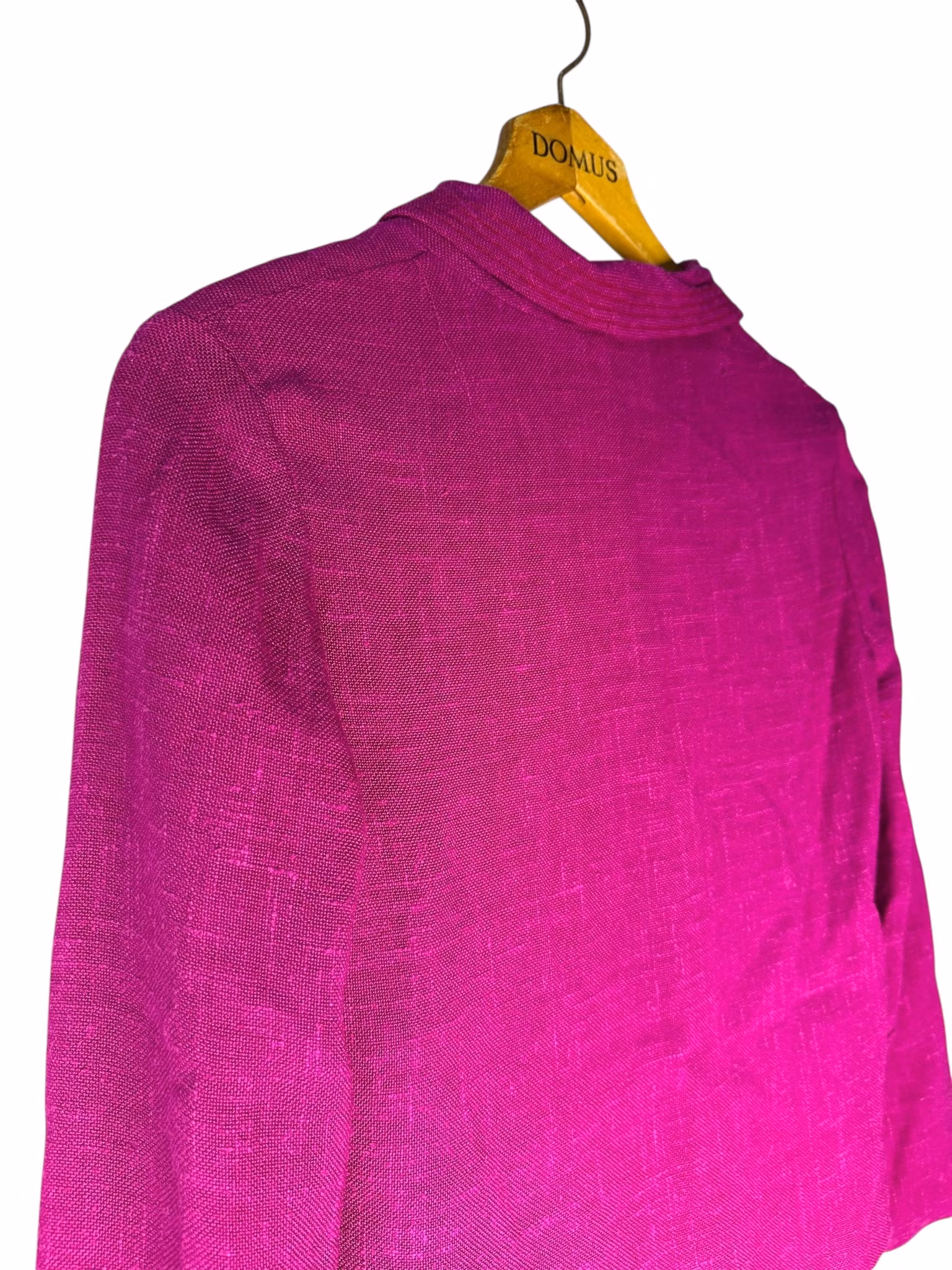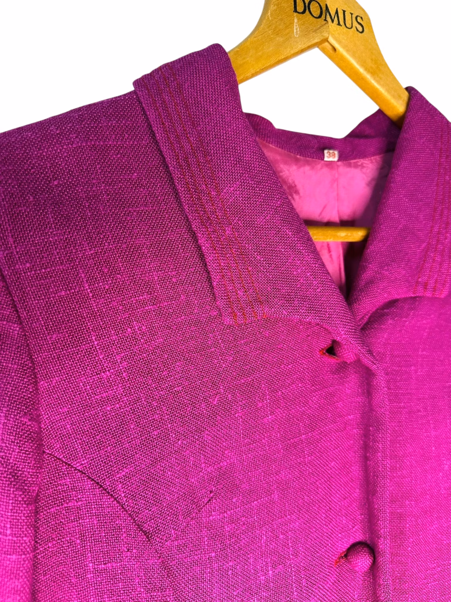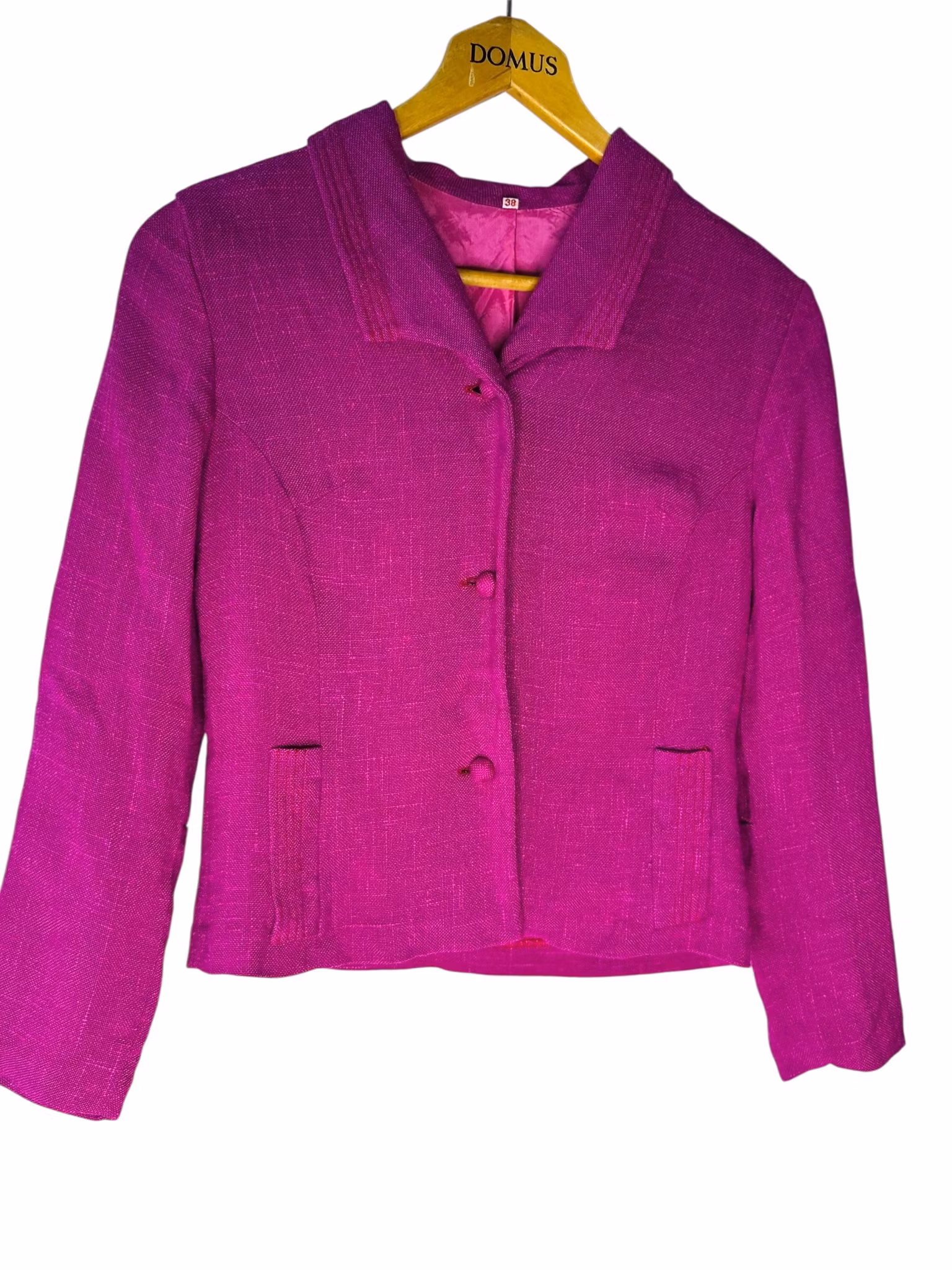 Beskrivning: En söt, vintage kavaj. Konfektionssydd i ett luftigt vävt tyg. Kragen har tunna ränder och kavajen stängs med tre klädda knappar. Helfodrad med rosa silkigt tyg. Uppfattas som liten i storlek.