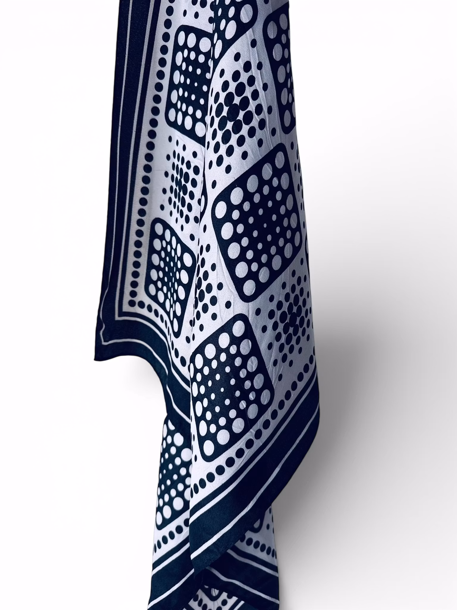Beskrivning: Vintage fyrkantig scarf i svart och vitt med ett grafiskt mönster av rutor fyllda med cirklar.