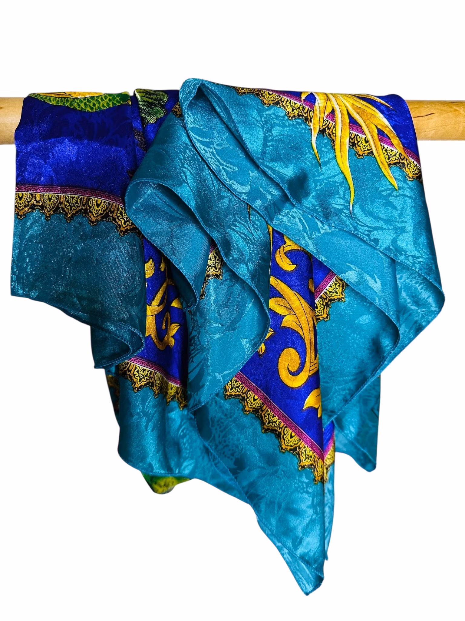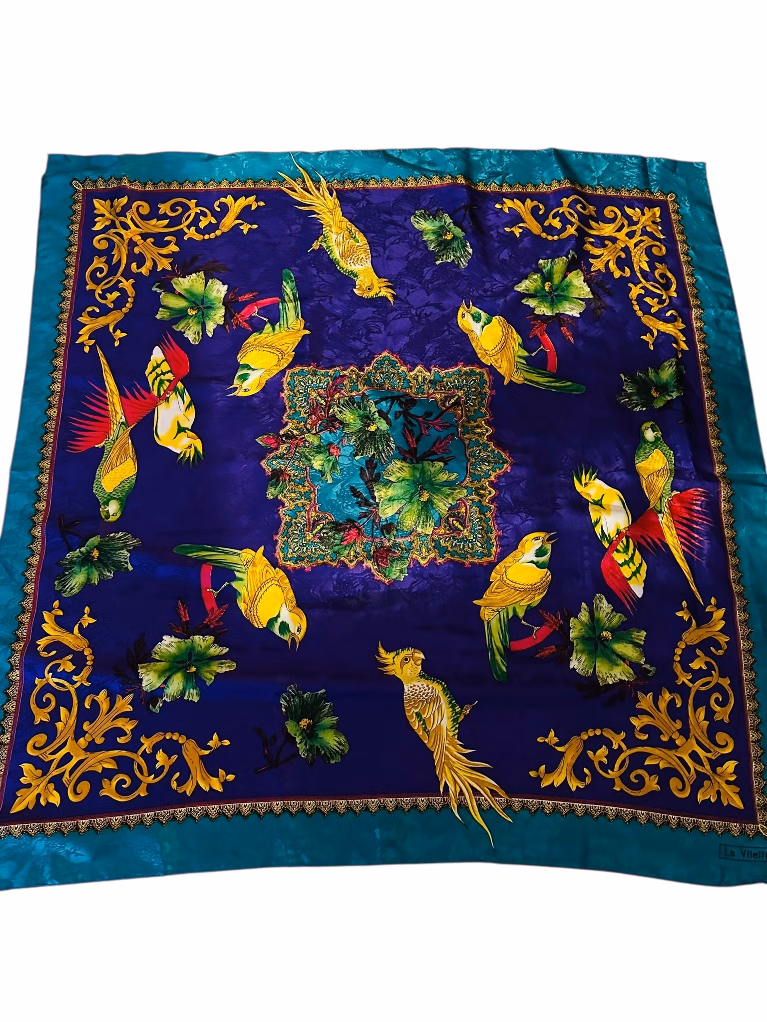 Beskrivning: Italiensk, vintage sidenscarf med starka färger och härlig lyster. Stor storlek. Turkos ram med lila mitt och ett motiv av fåglar och guldiga ornament.