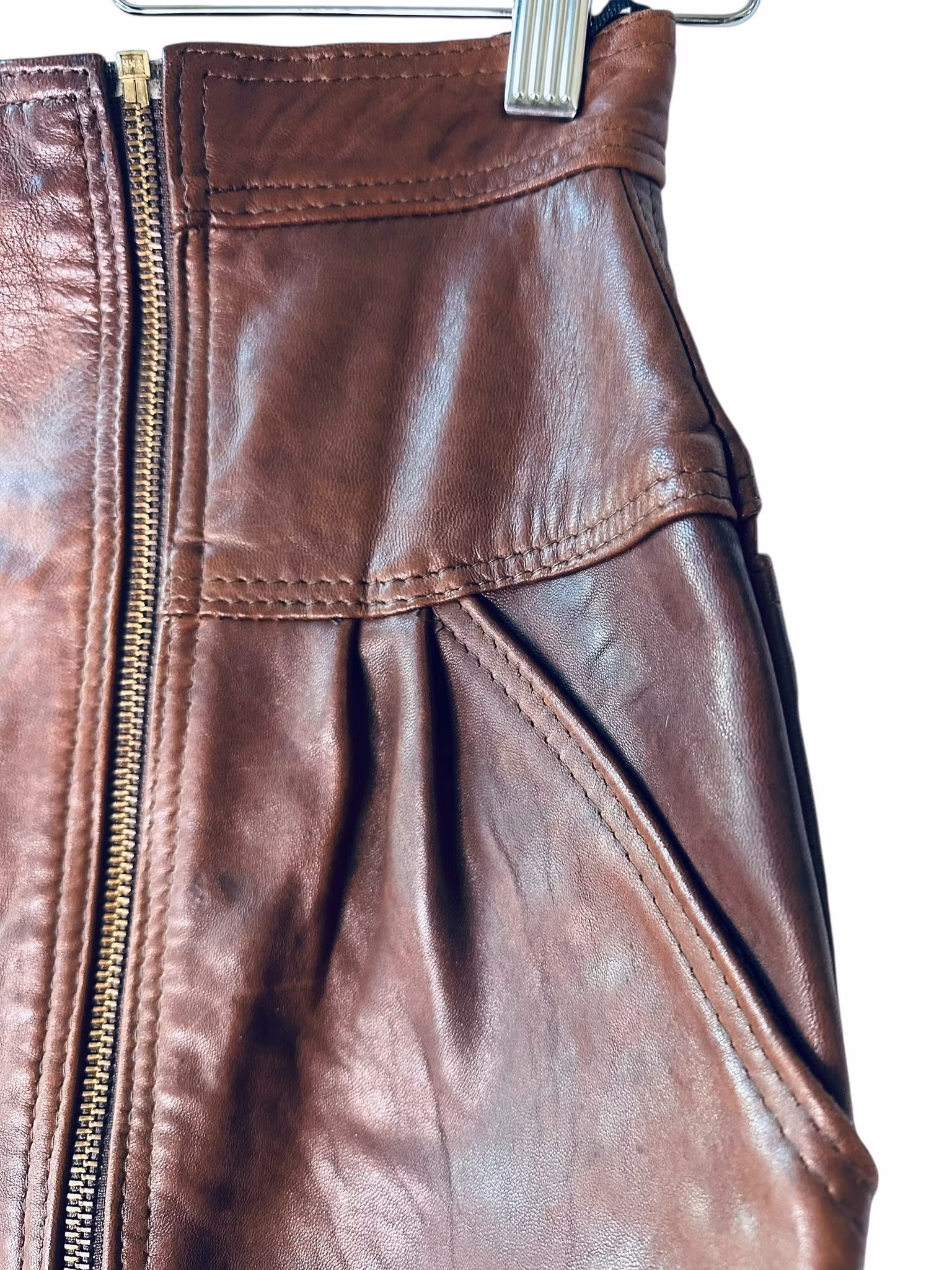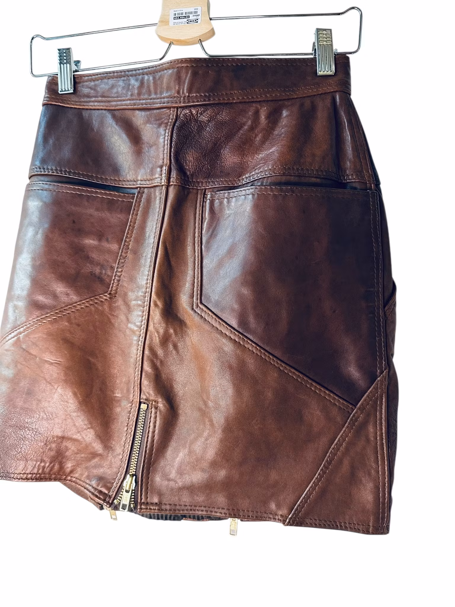Beskrivning: Mörkt brun kjol med två dragkedjor som går hela vägen - nerifrån och upp! Det är också så kjolen tas av och på. Snedställda fickor i sidorna. Bakfickor med sneda nederkanter. Slits med dragkedja. Helfodrad. Patina i lädret. Från Sardar.