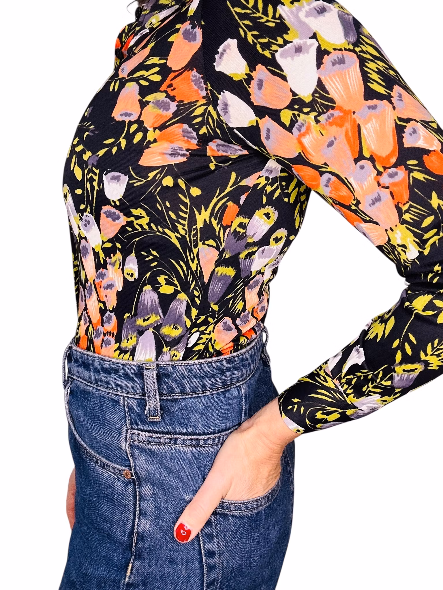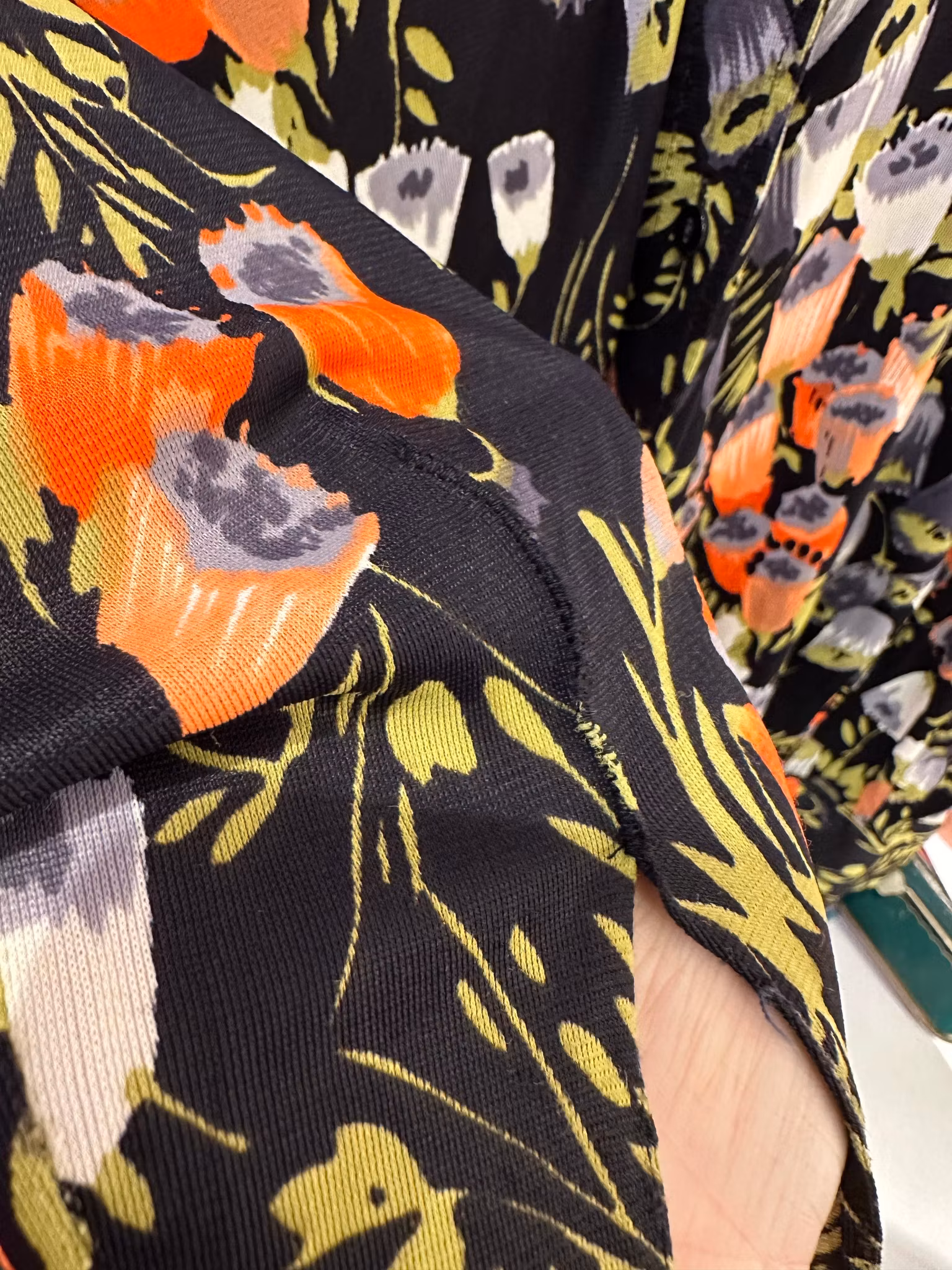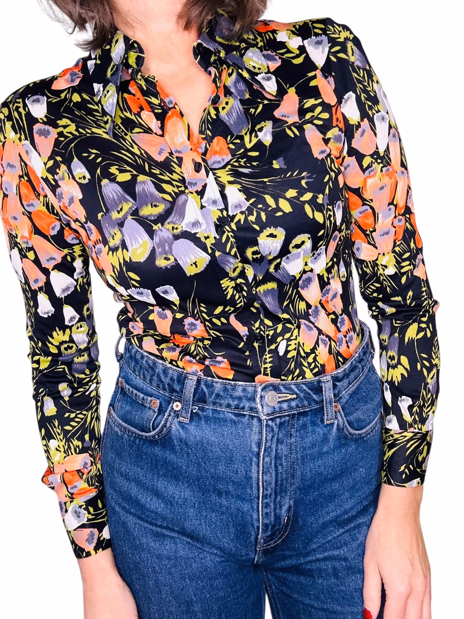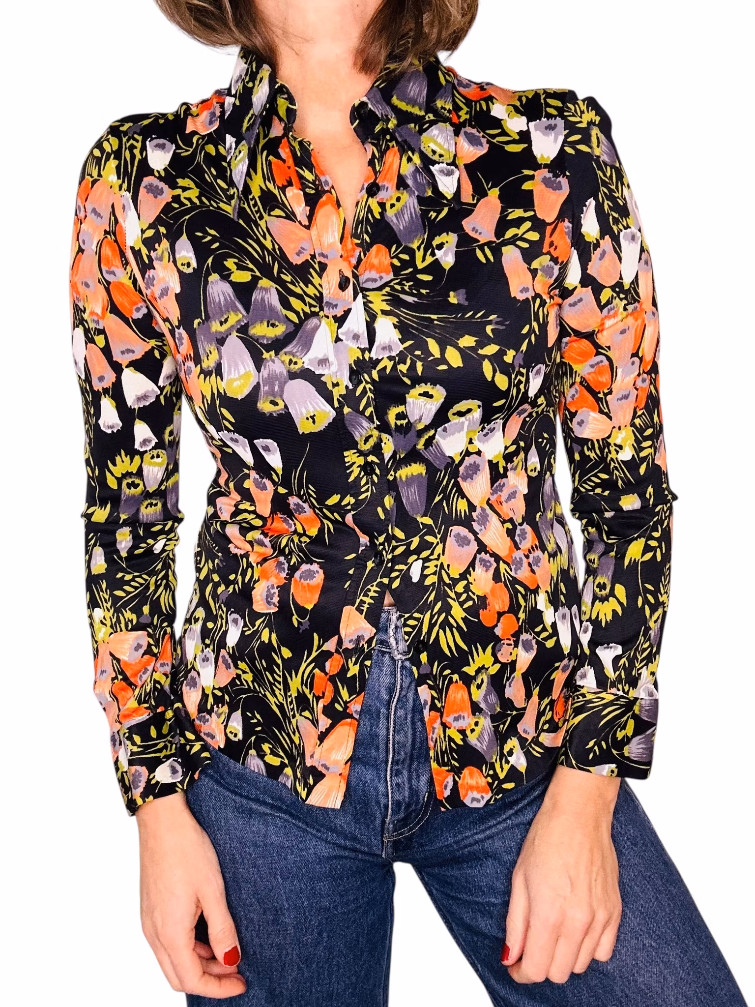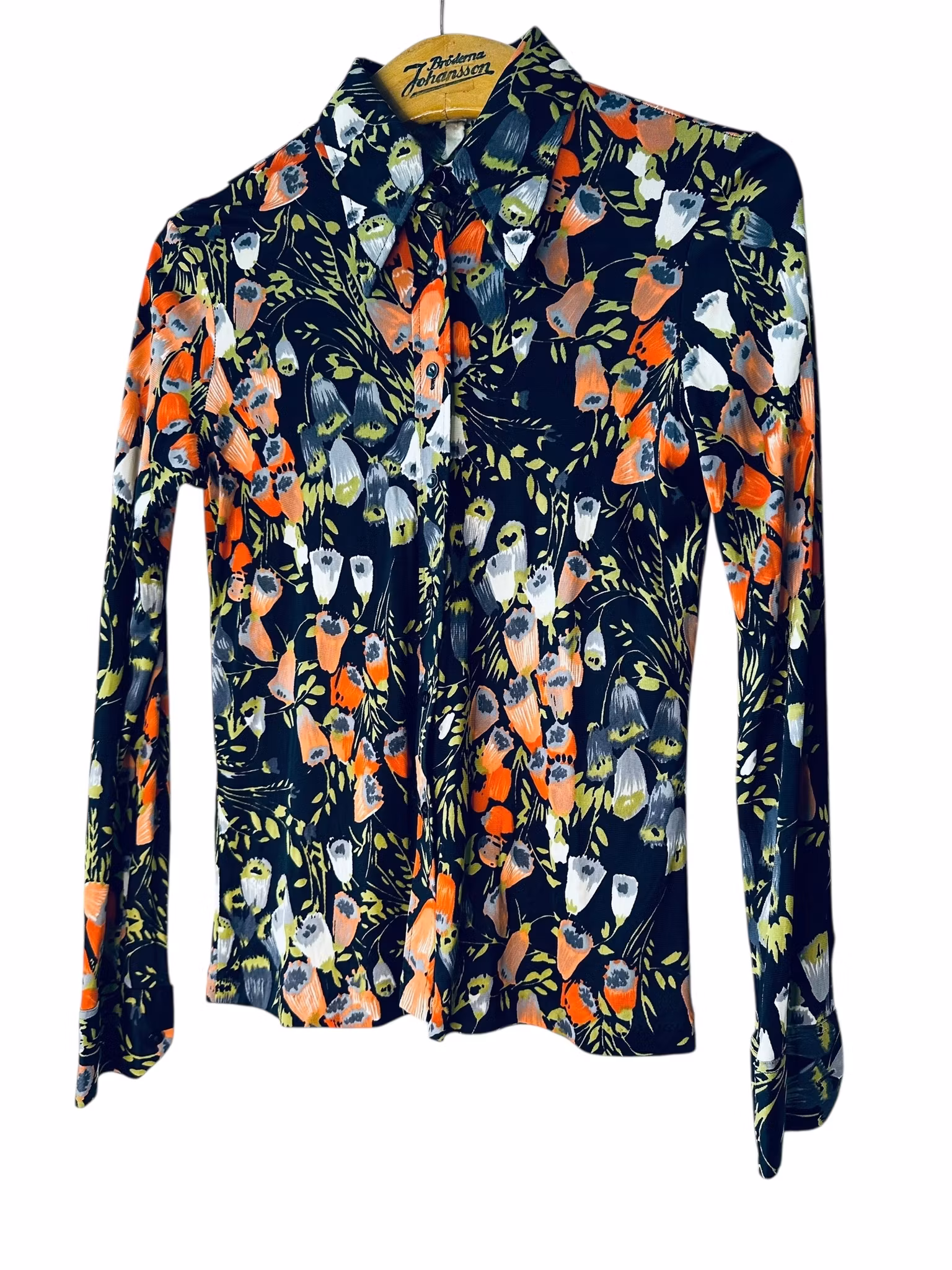 Beskrivning: En blank och nätt 70-talsskjorta i acetat med svart botten och klockade blommor i olika färger. Tillverkad i Italien. Finns en lagning på ena ärmen, se sista bilden.
