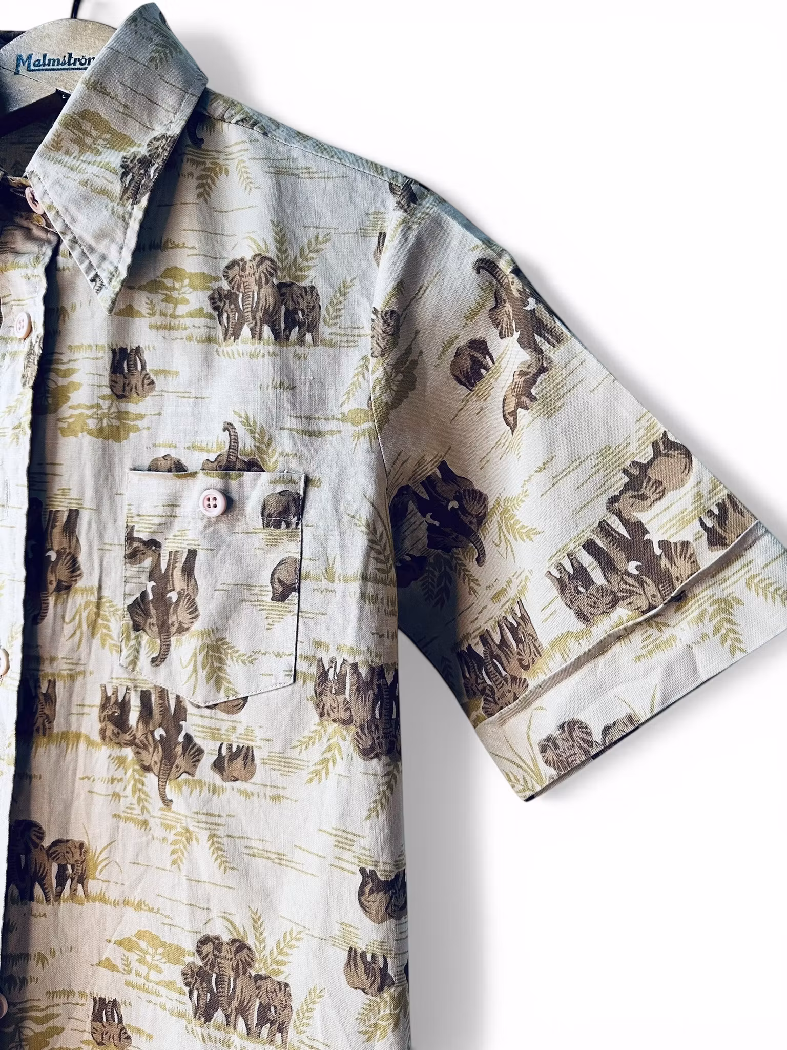 Beskrivning: Gullig skjorta med väldigt fint elefantprint. En bröstficka och knappar hela vägen ner framtill. Från New Line. Material saknas men det uppskattas vara bomull eller bomullsmix.