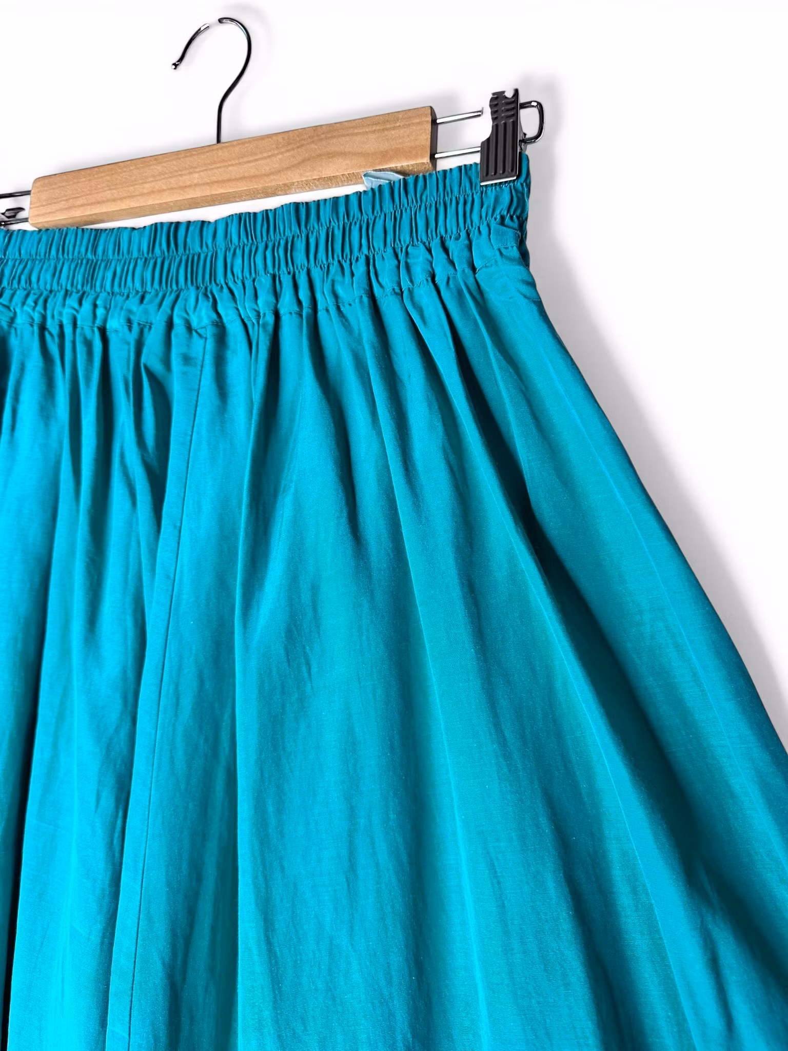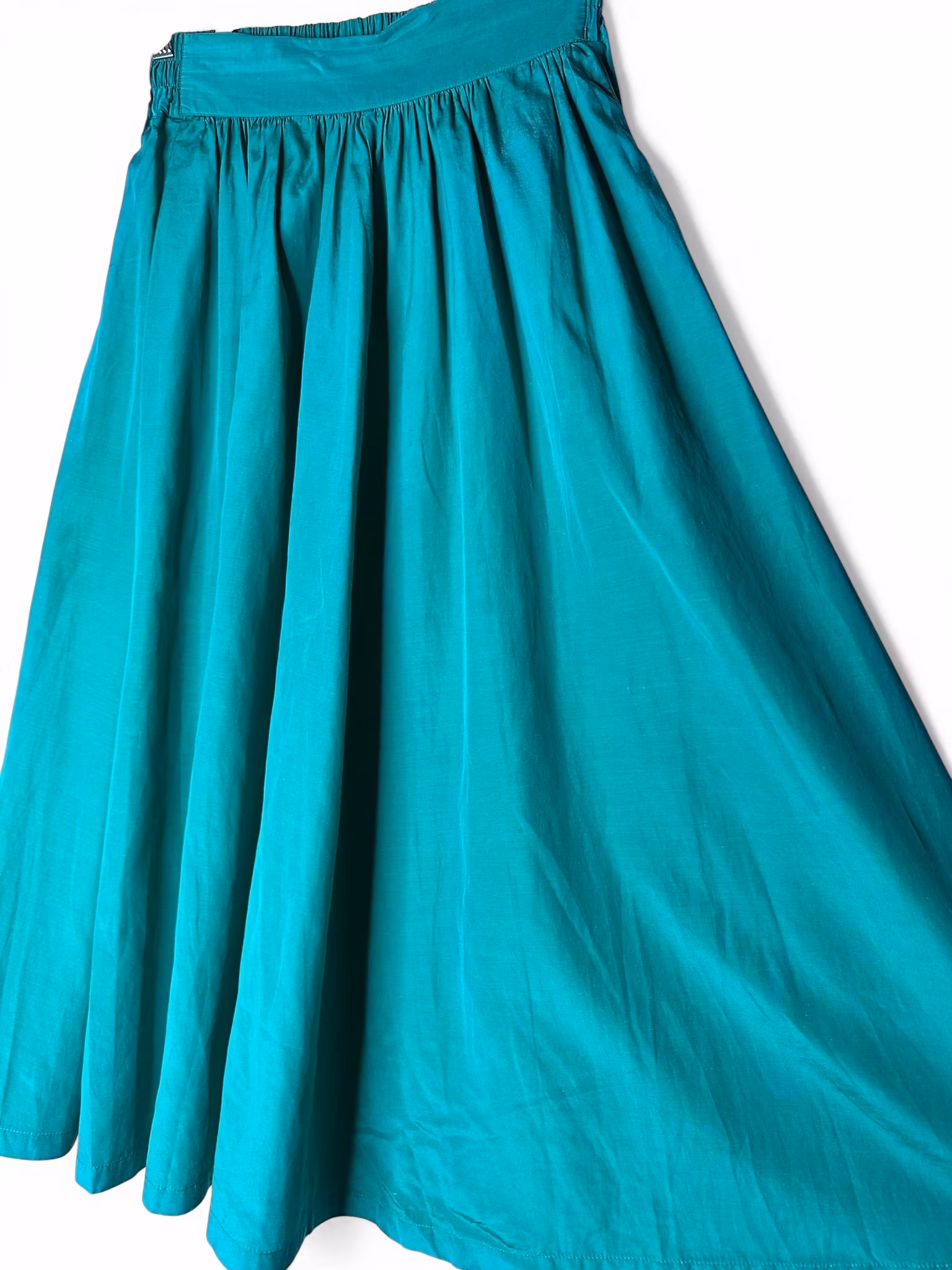 Beskrivning: En midikjol i smaragdgrön sidenmix från San Antonio. Hög midja och bred linning med resår i bakkant och en ficka i sidan. Tyget faller i mjuka veck och färgen är en grön som verkligen fångar ljuset och sidenets lyster. Uppskattningsvis från sent 80-tal/tidigt 90-tal. "Made in Hong Kong". Under den här tiden tillverkades många kvalitetsplagg i Hong Kong, som då var ett globalt centrum för avancerad textilproduktion - särskilt för siden.
