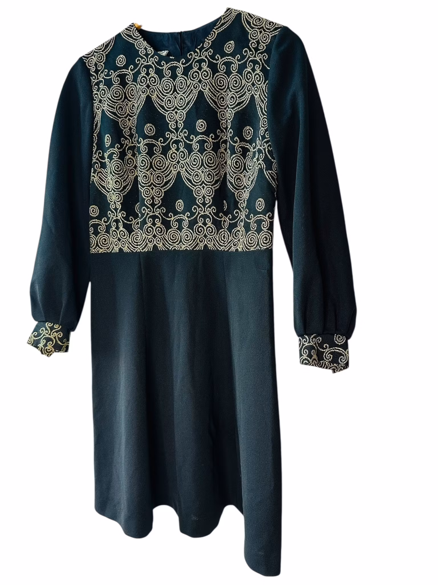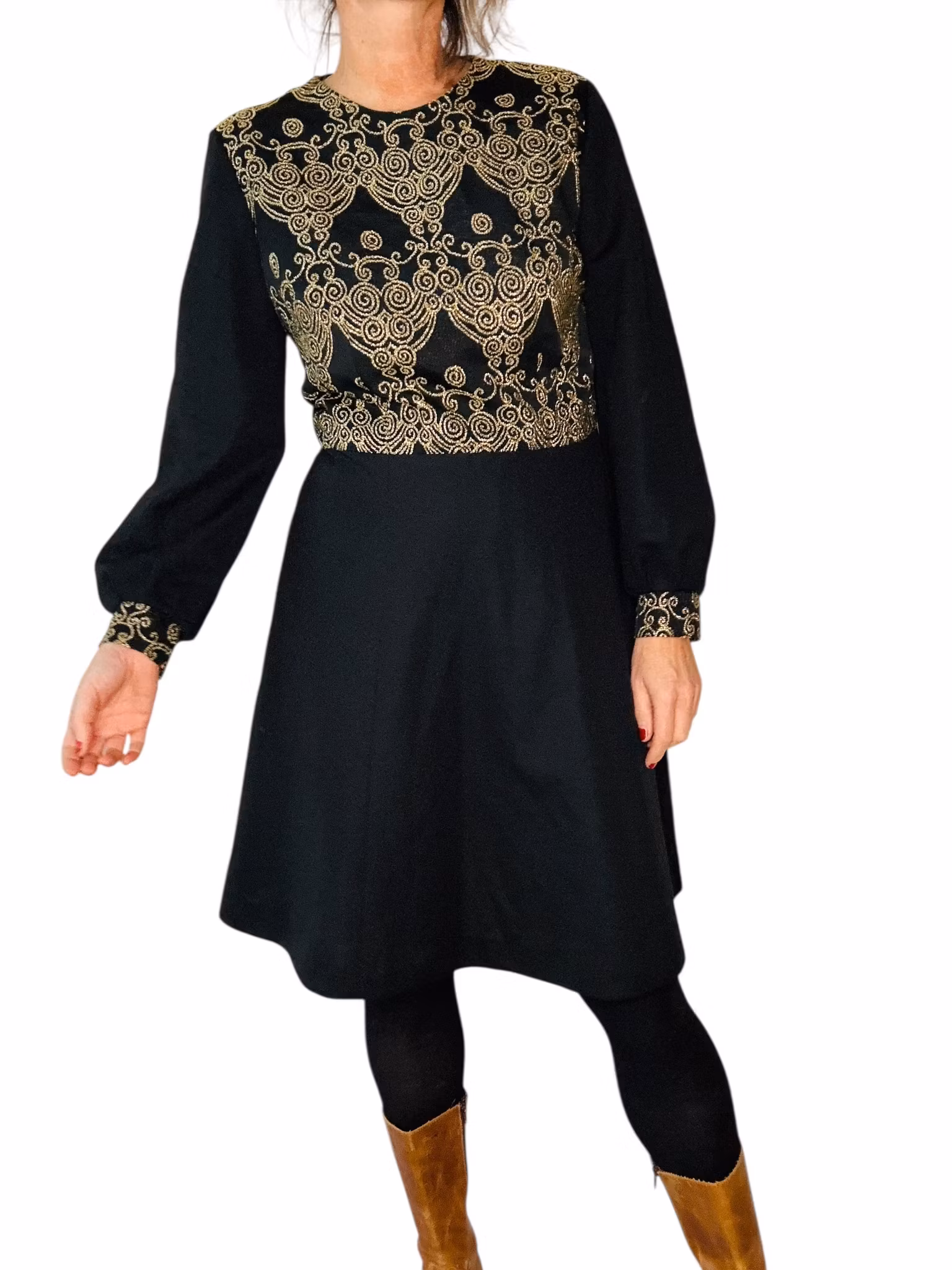 Beskrivning: En svensk vintage klänning från Hyltea. Svart i midilängd med guldmönster framtill. Ärmarna är voluminösa och avslutas med guldmönster de med. Stängs med dragkedja i ryggen.