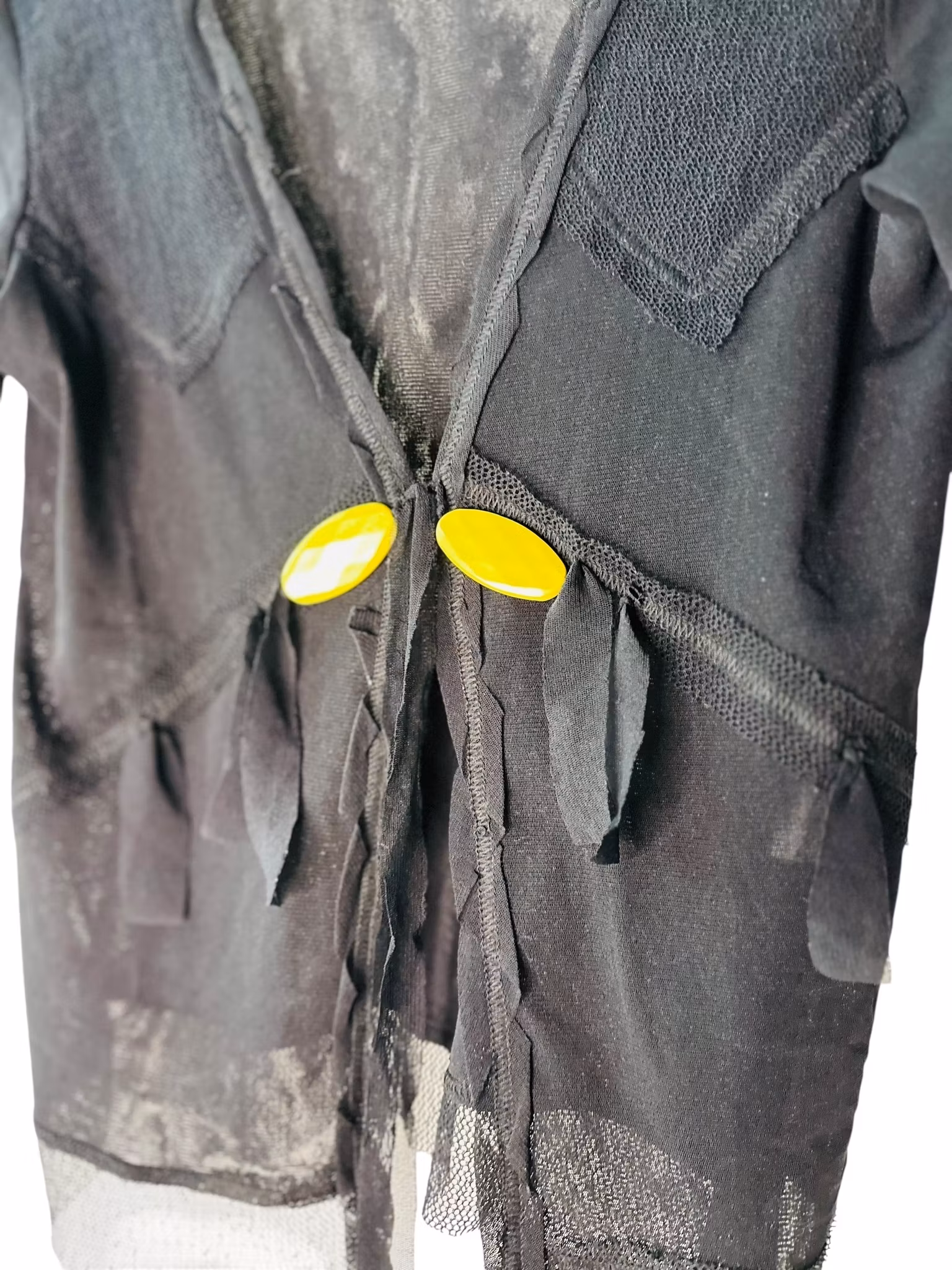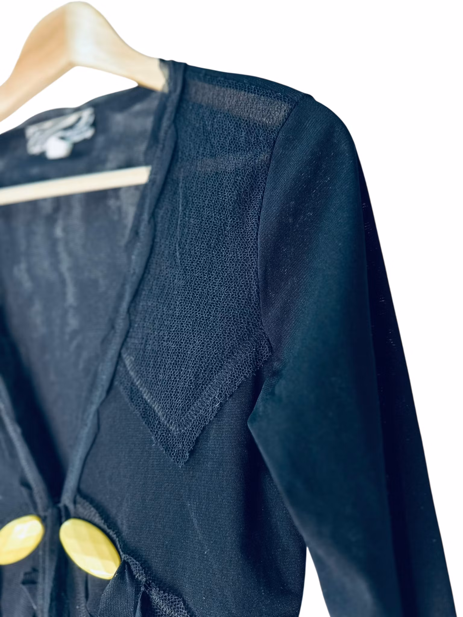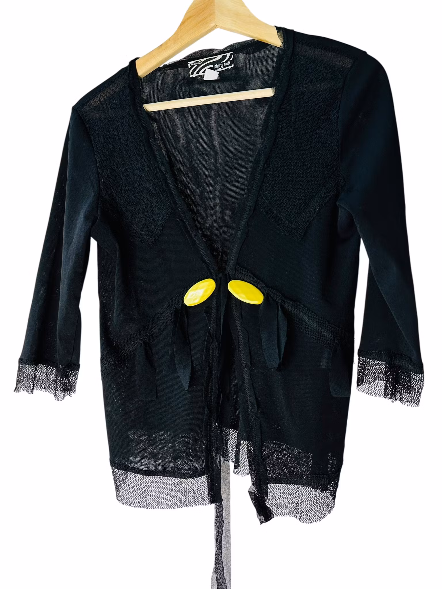 Beskrivning: En 00-talet-kofta i svart mesh - dubbel på sina ställen och glesare på andra. Kantade med glesare mesh och knyts med meshband framtill. Finns även två stora, guldgula dekorativa knappar. Från Roberto Naldi.