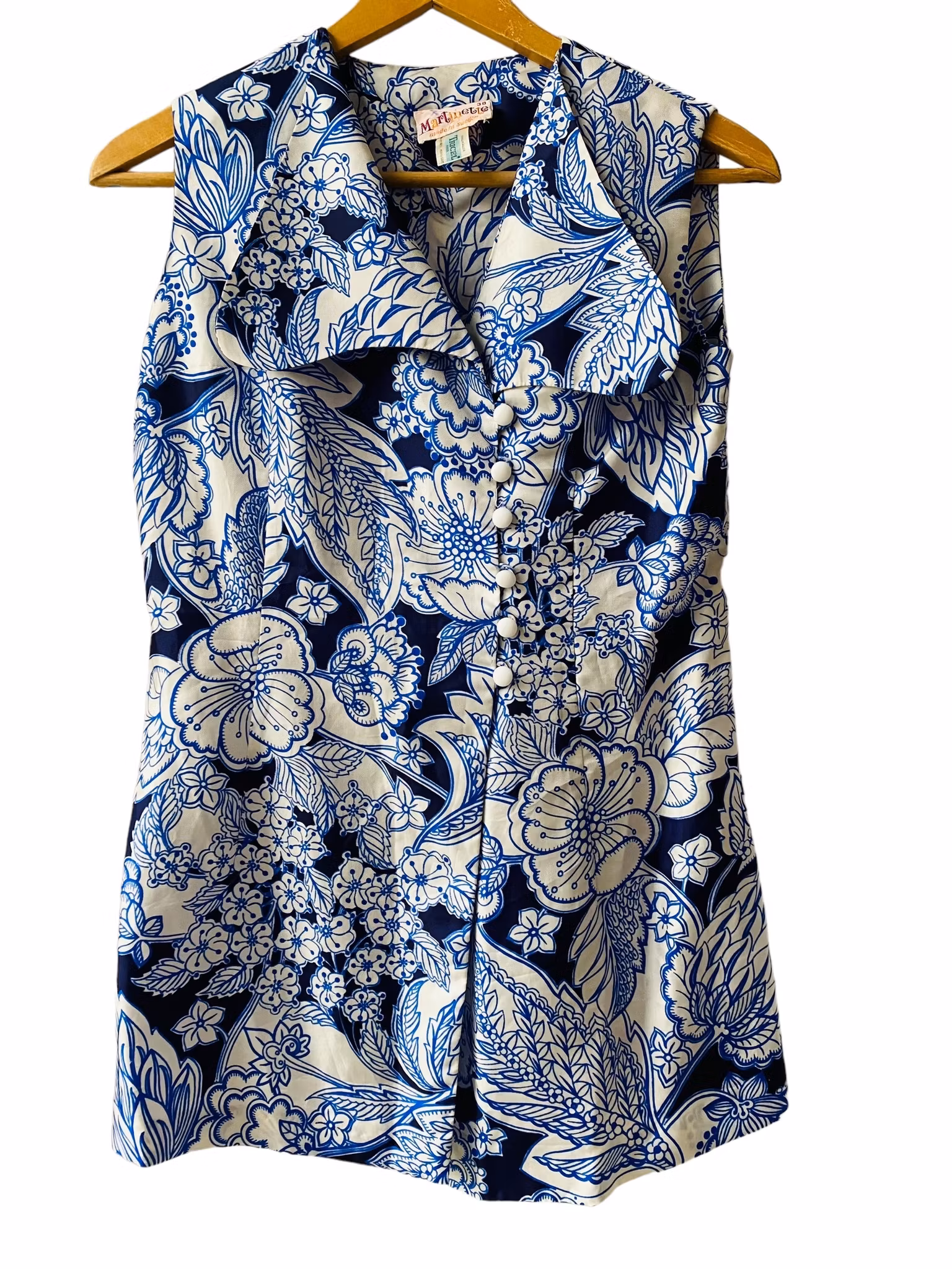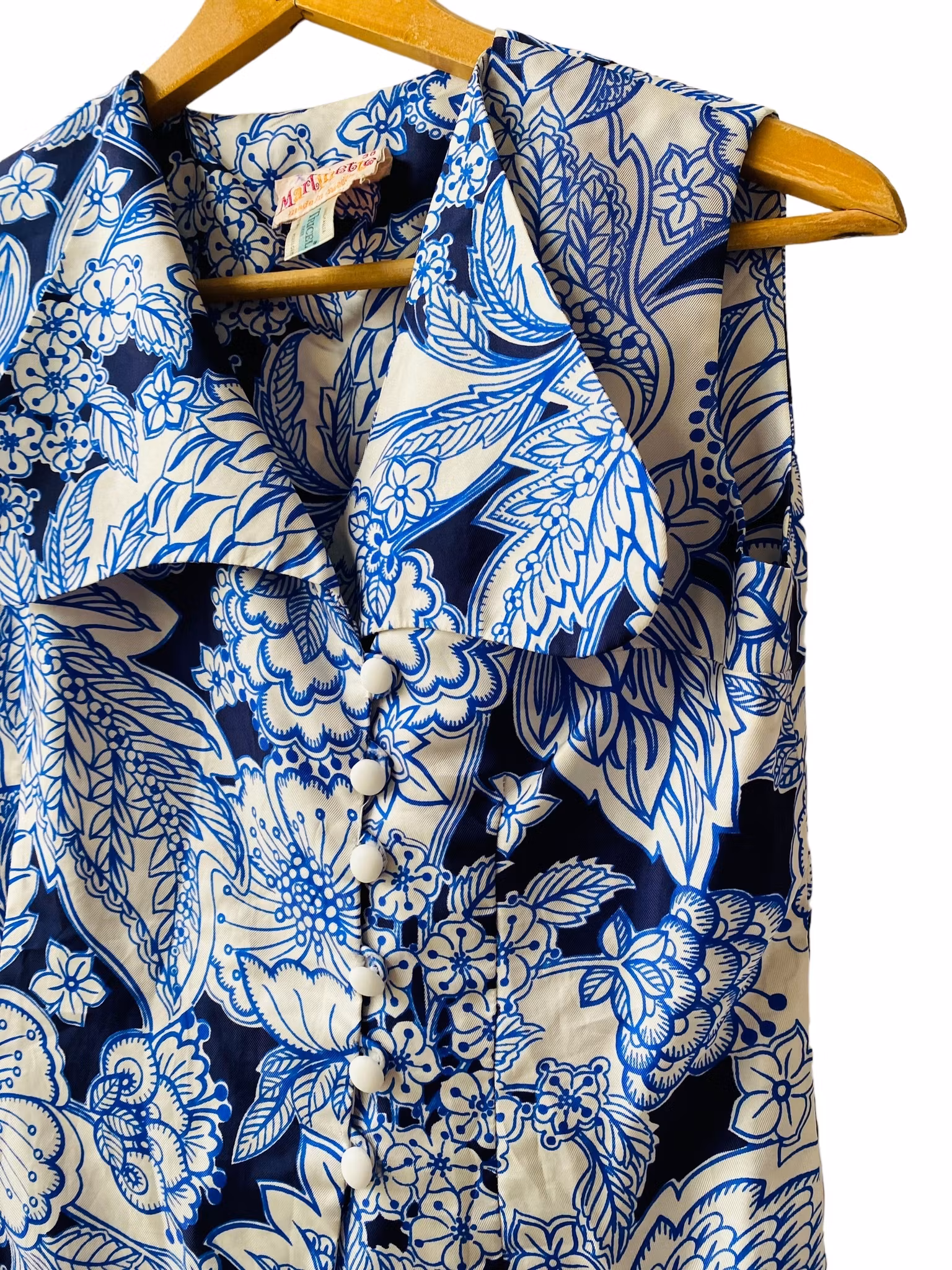 Beskrivning: Vacker topp från svenska Martinette i ett material som heter Tricel, en slags acetat. Det är vävt och lite blankt med ett härligt mönster med blommor och blad k vitt och blått. Toppen har sned knäppning med små vita knappar högst upp. I halsen en stor, rundad krage.