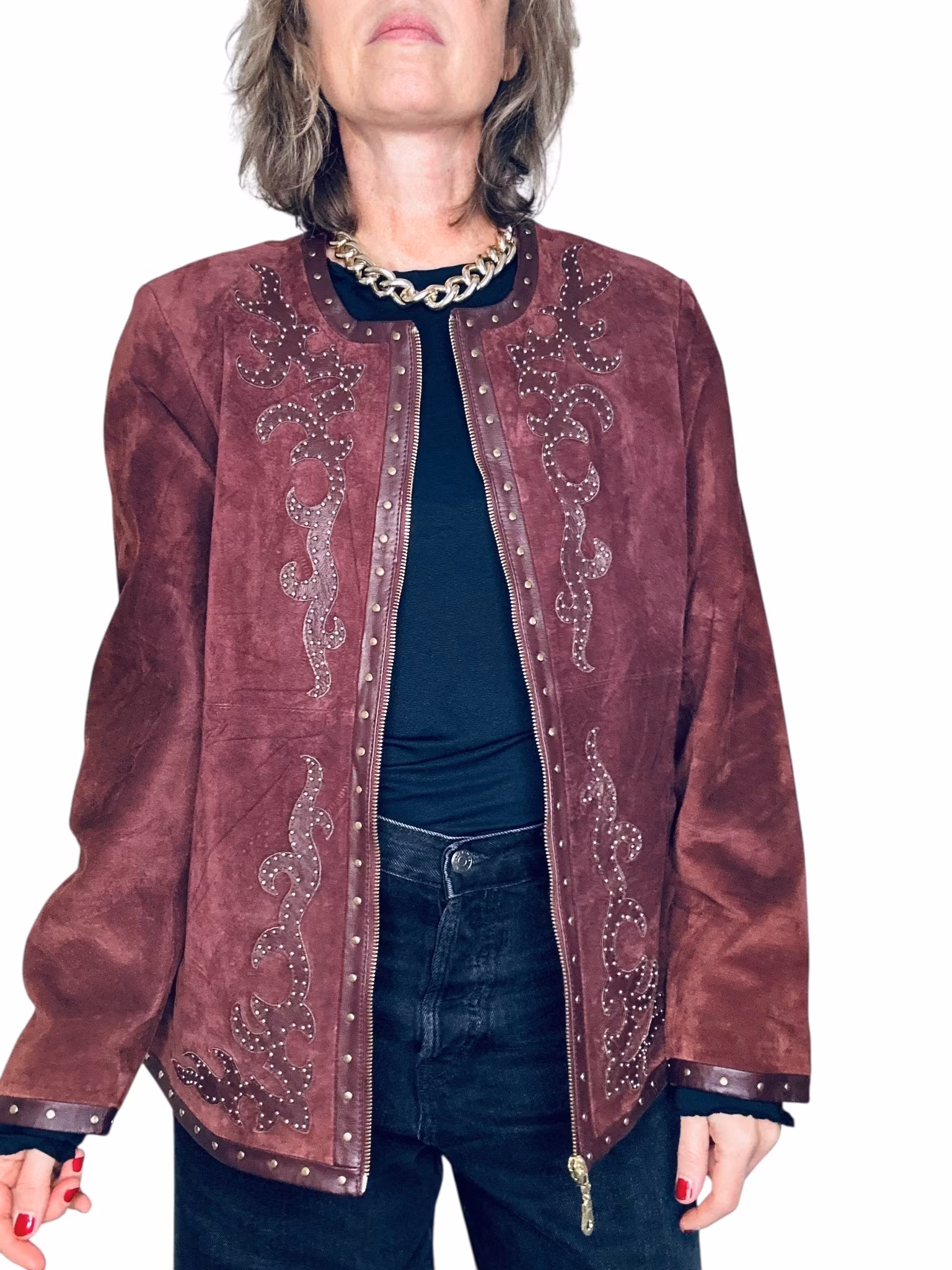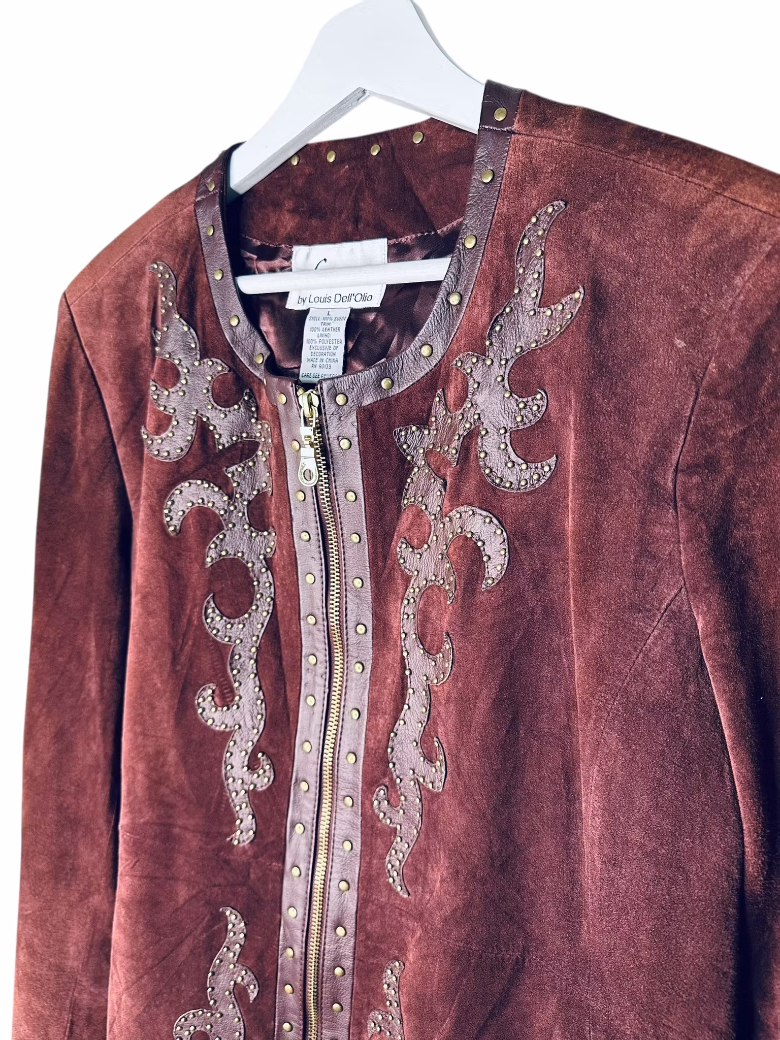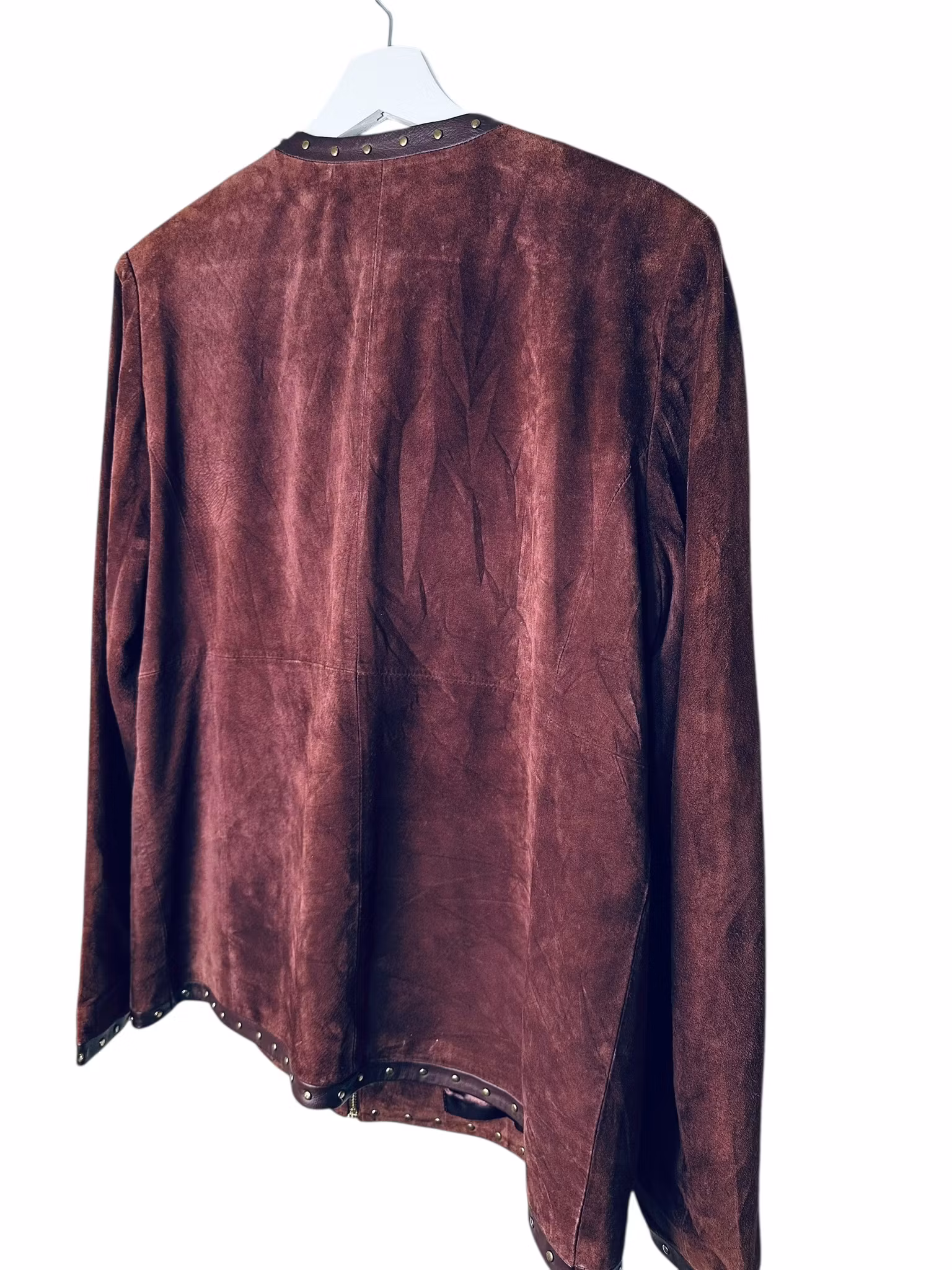 Beskrivning: Otrolig vintage italiensk jacka i mocka med detaljer i skinn och nitar. Mönster på framsidan, fickor i sidorna och kantad med skinn och nitar. Kraftig gulddragkedja och helfodrad. Från Linea by Louis Dell'Olio.