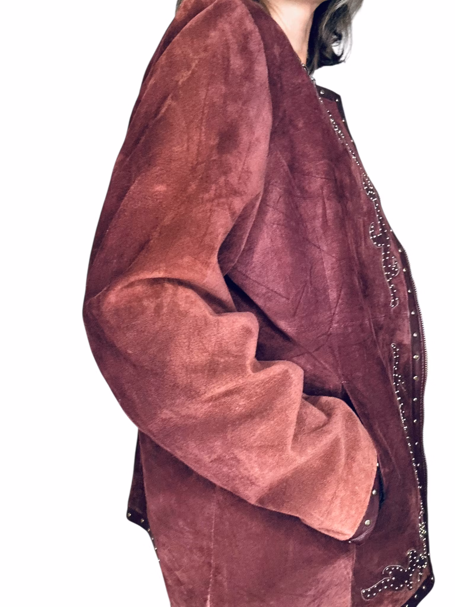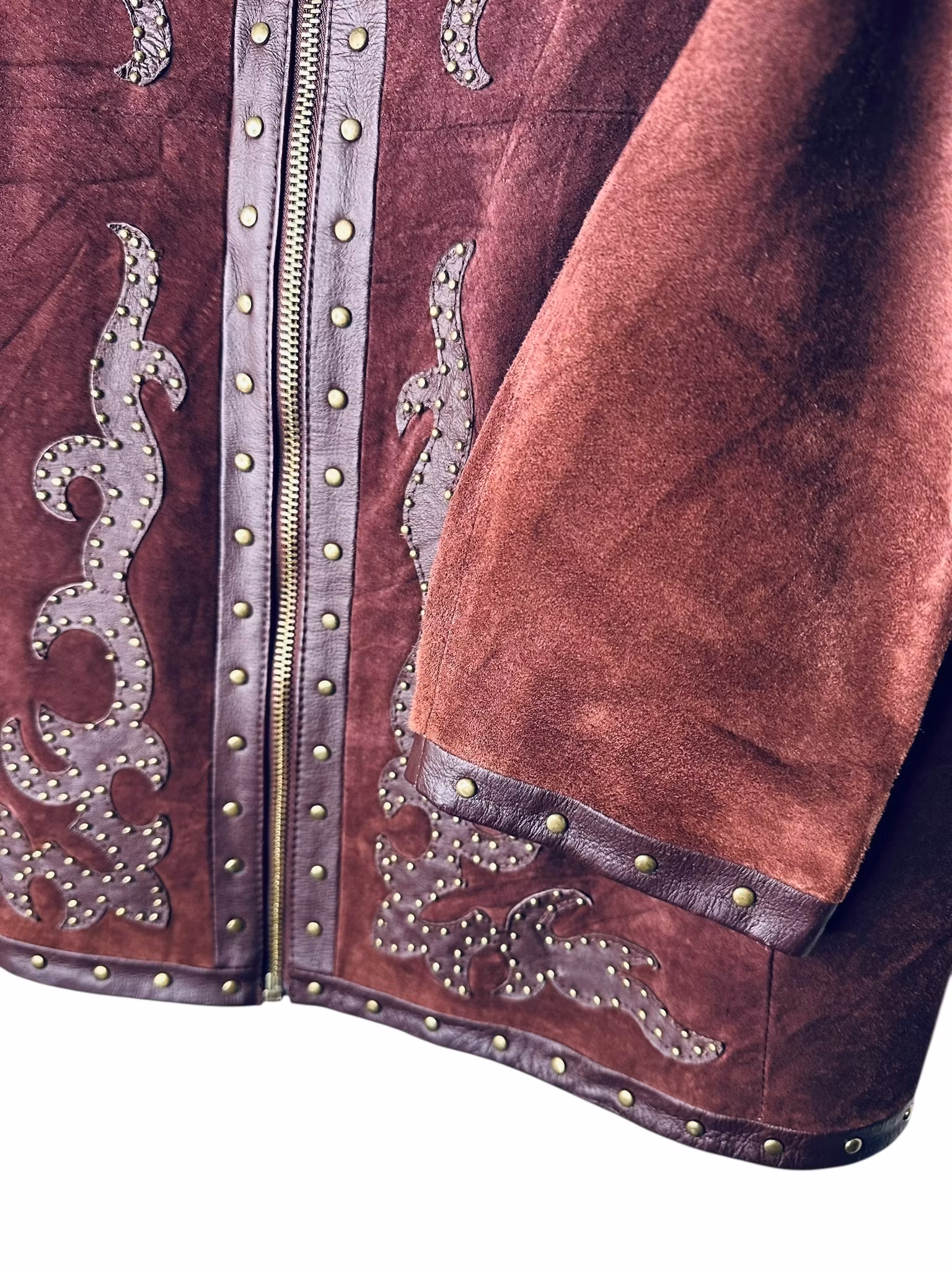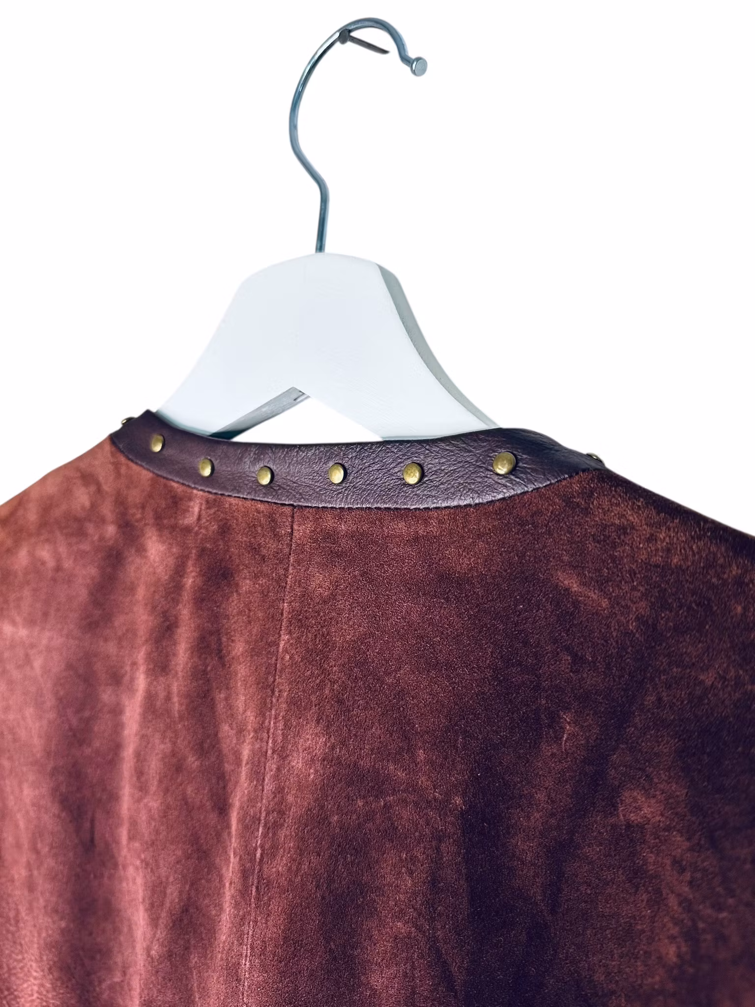 Beskrivning: Otrolig vintage italiensk jacka i mocka med detaljer i skinn och nitar. Mönster på framsidan, fickor i sidorna och kantad med skinn och nitar. Kraftig gulddragkedja och helfodrad. Från Linea by Louis Dell'Olio.
