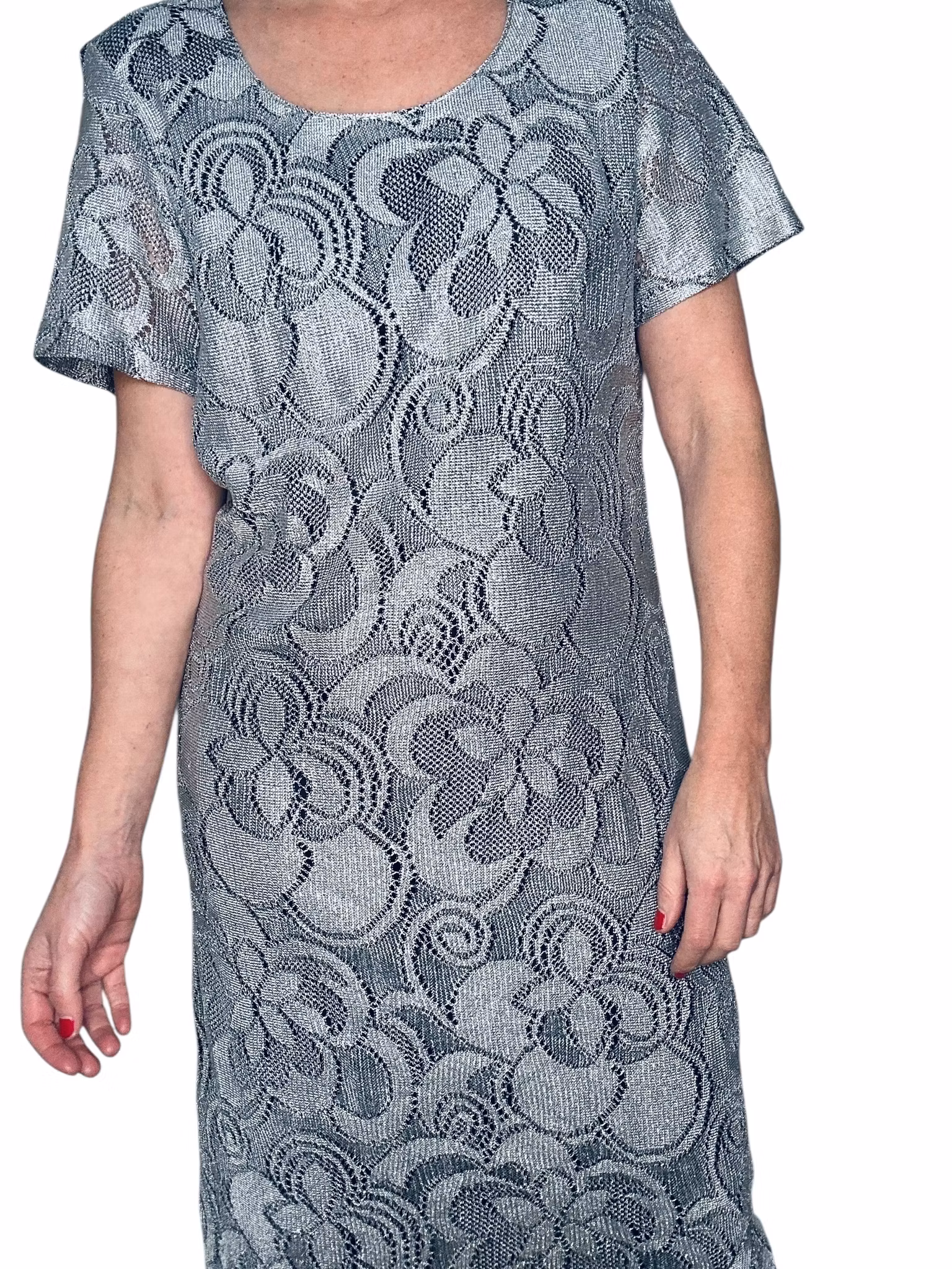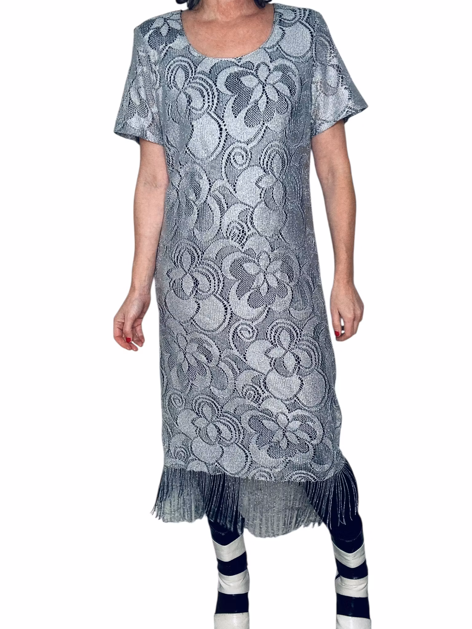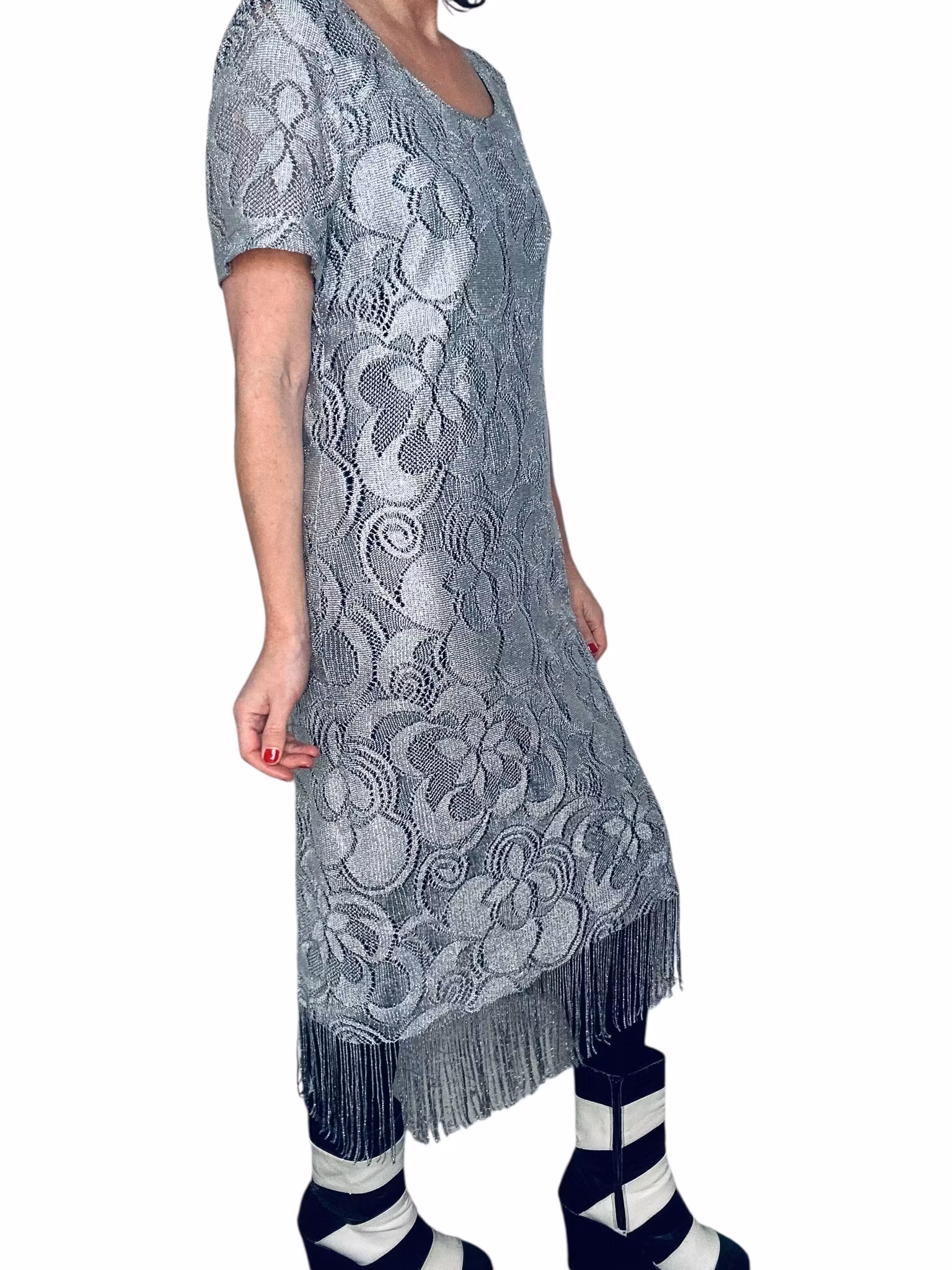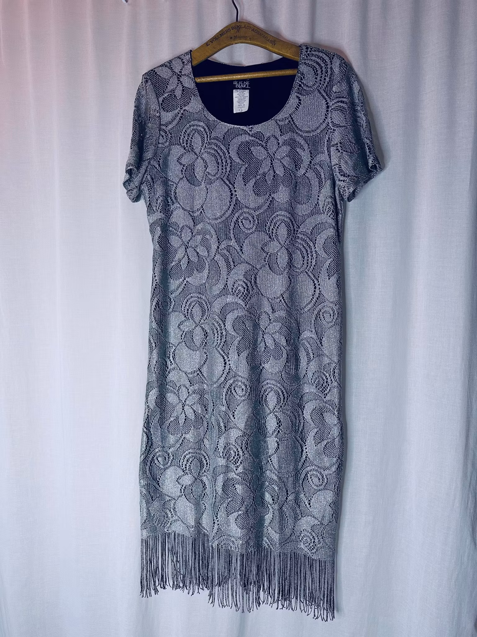 Beskrivning: Virkat i silver! Hur snyggt? Den här amerikanska vintageklänningen känns verkligen som att den kunnat gjorts idag, med allt det virkade vi sett senaste året. Men har du sett virkat i silver? Klänning i rak modell med vid, runt halsringning och midilängd som avslutas med fransar - vad annat? Från Helen Blake. Helfodrad i stretchigt svart material.