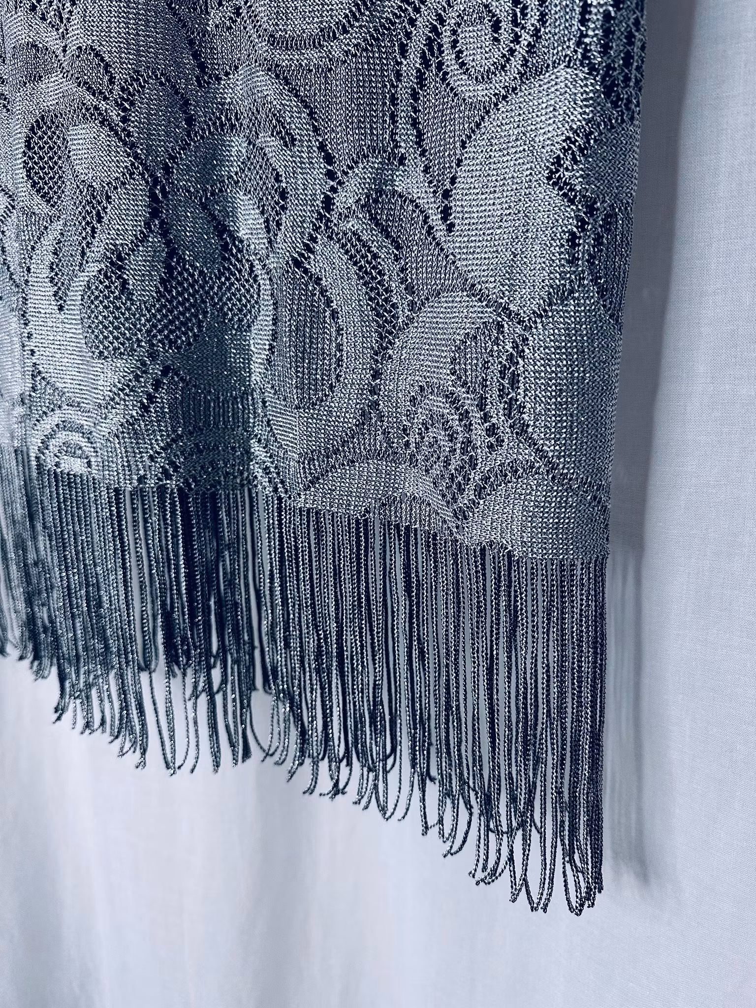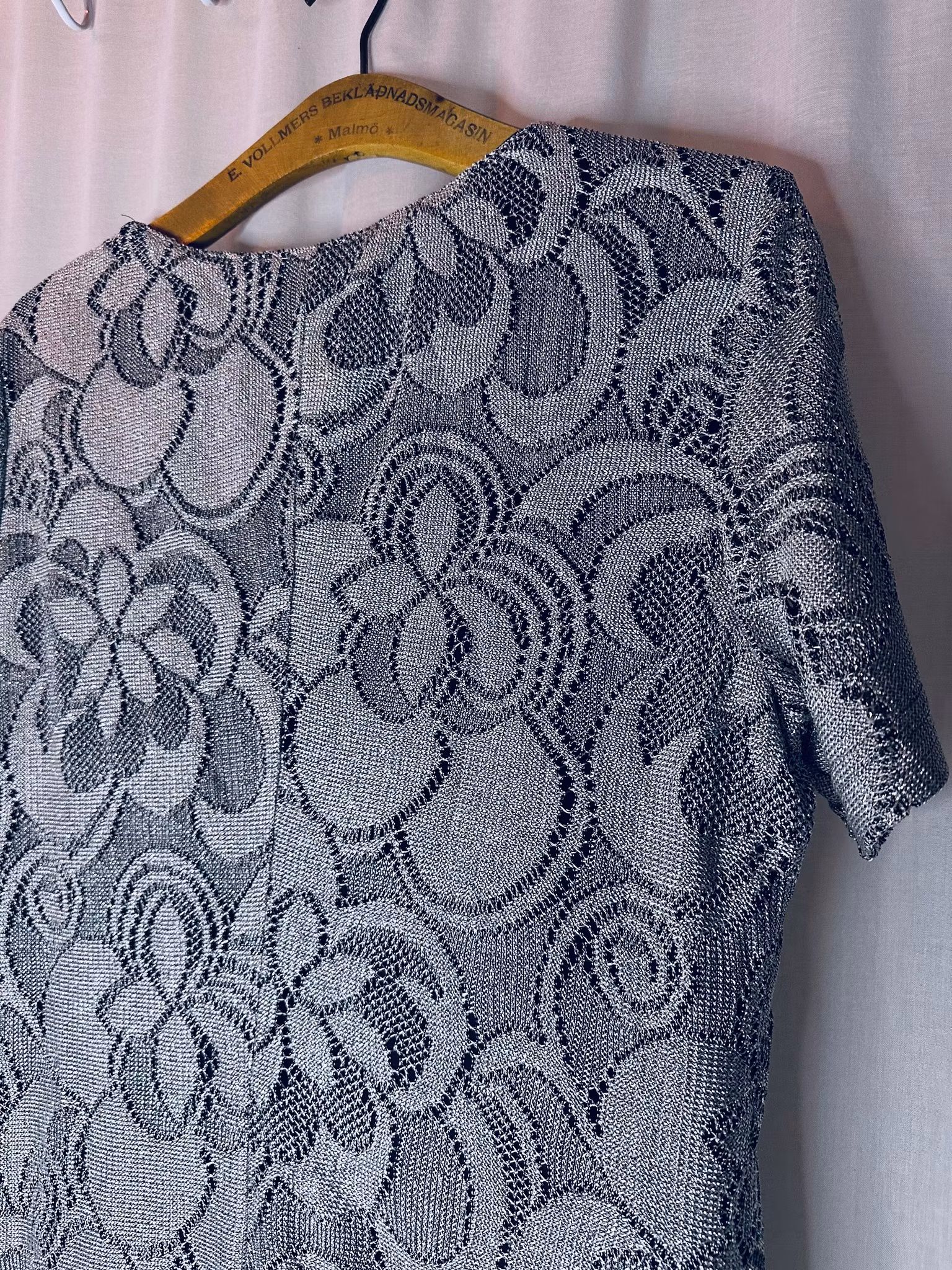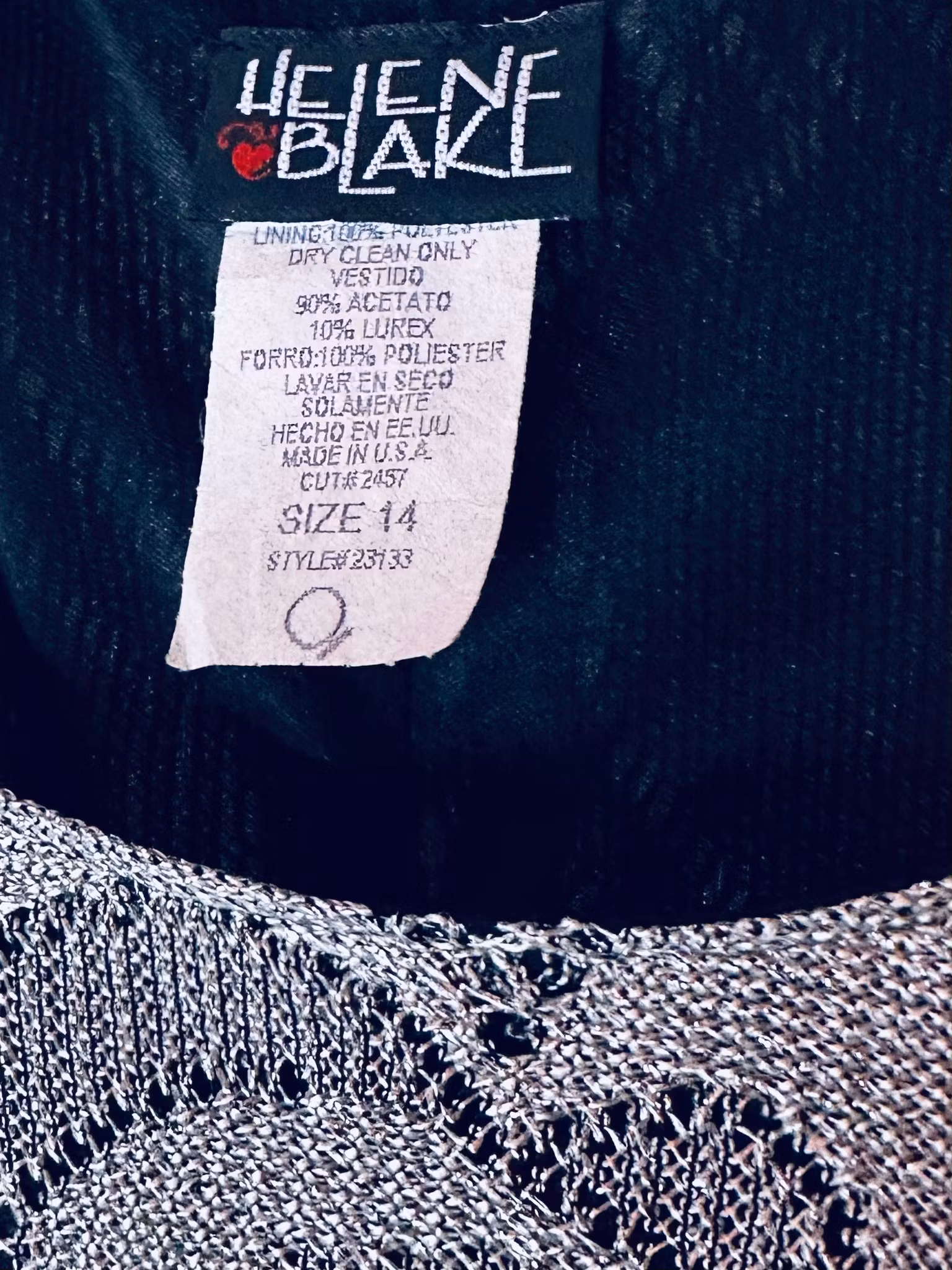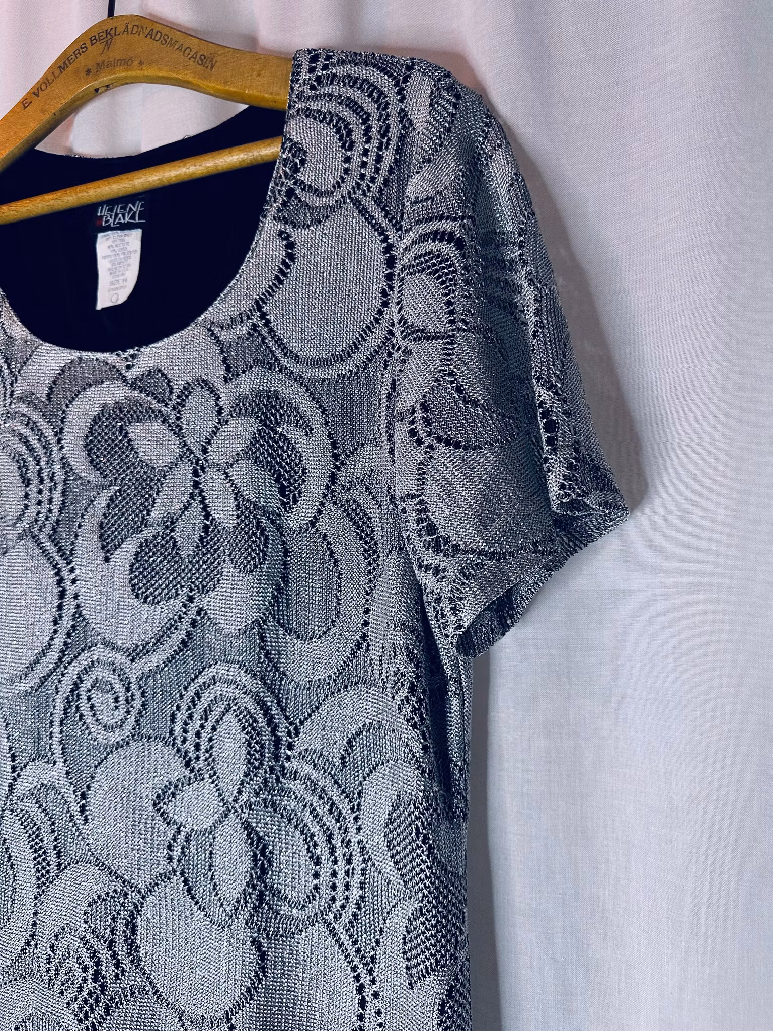 Beskrivning: Virkat i silver! Hur snyggt? Den här amerikanska vintageklänningen känns verkligen som att den kunnat gjorts idag, med allt det virkade vi sett senaste året. Men har du sett virkat i silver? Klänning i rak modell med vid, runt halsringning och midilängd som avslutas med fransar - vad annat? Från Helen Blake. Helfodrad i stretchigt svart material.
