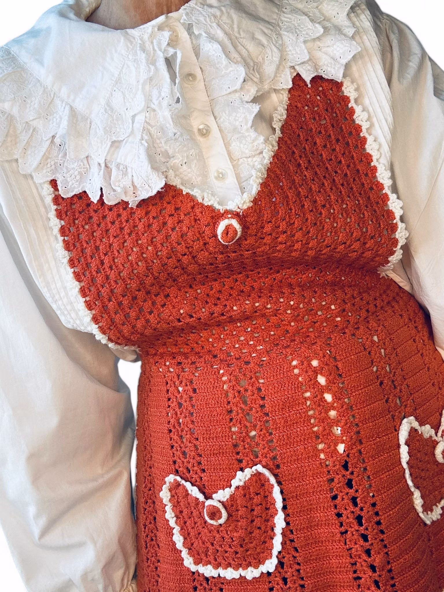 Sökord: Vintage förkläde, virkat förkläde, handvirkat vintage, 70-tals vintage, rött virkat förkläde, crochet apron, apron dress, boho vintage, retro förkläde, romantiskt vintageplagg, modeveckotrend, Copenhagen Fashion Week trend, layering trend, slow fashion.