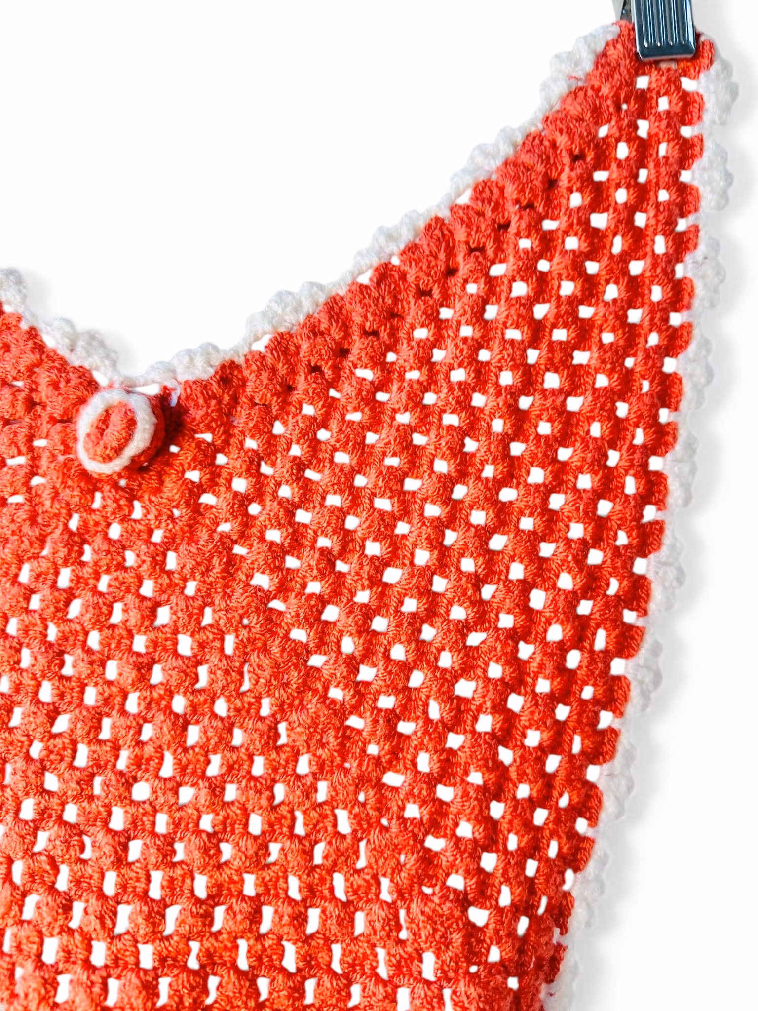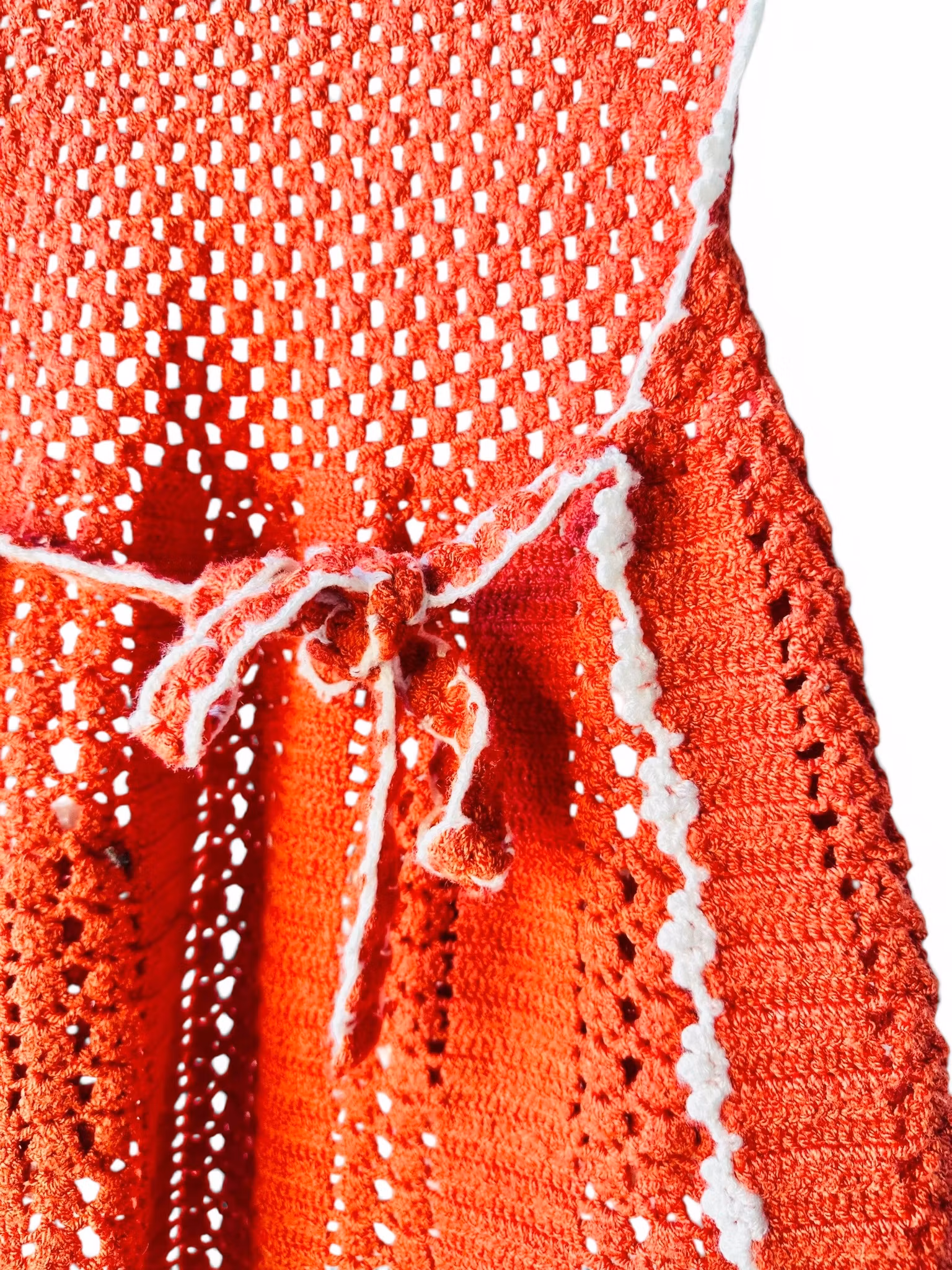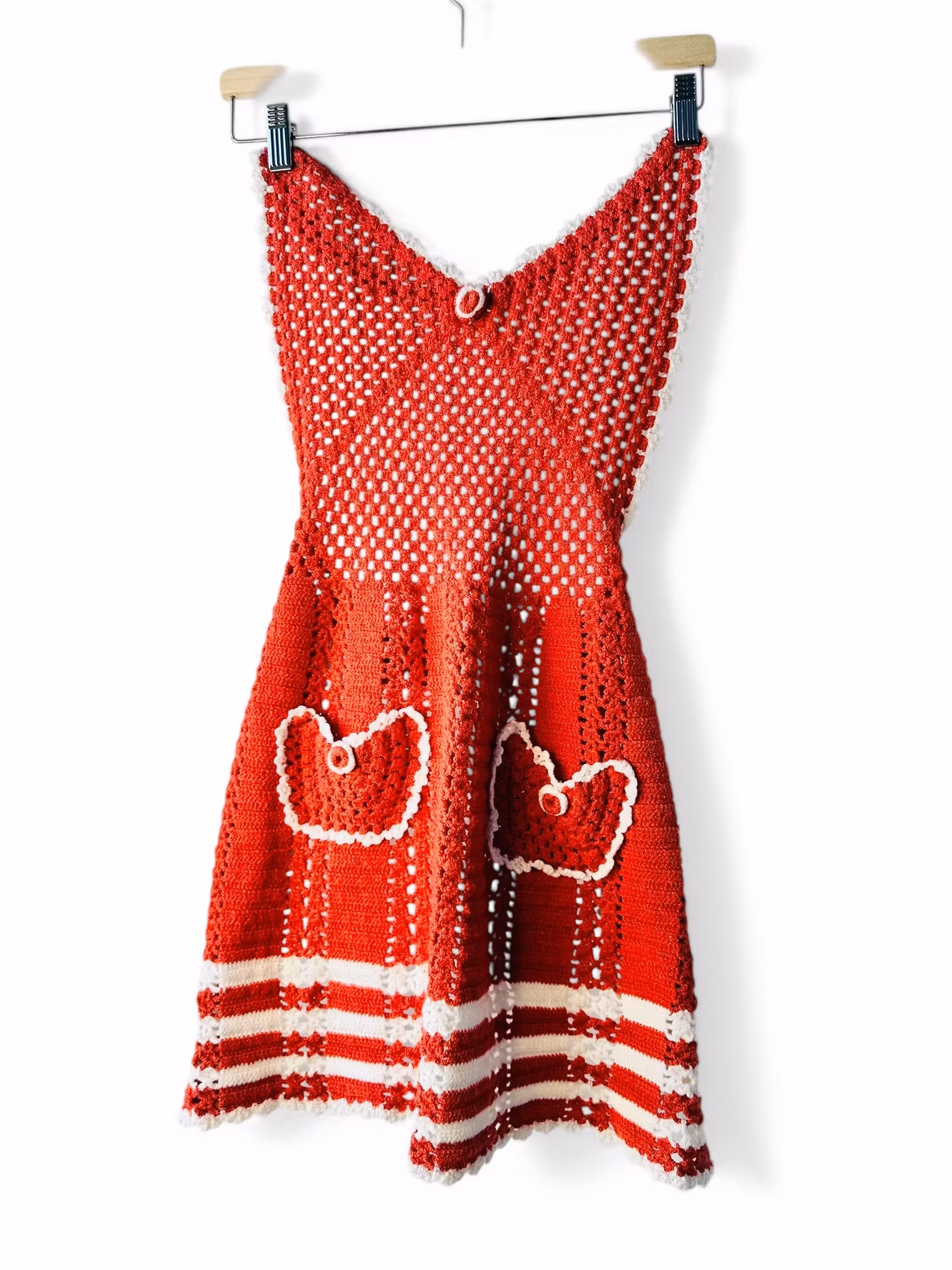 Beskrivning: Ett charmigt och handvirkat vintageförkläde i klarrött med vita detaljer. Ett unikt hantverksplagg som lika gärna kan bäras som en lekfull klänning – helt i linje med vårens stora stylingtrend från internationella modeveckor. Detta handgjorda förkläde är ett underbart exempel på 1970-talets kreativa och folkloristiska estetik. Den luftiga virkade strukturen och halterneckdesignen ger en smickrande silhuett, medan de dekorativa hjärtformade fickorna tillför en romantisk och lekfull känsla. Den roströda nyansen ramas in av vita detaljer och en randig fåll som gör plagget till ett verkligt statement. Under vårens modeveckor i Paris, Köpenhamn och Milano har förkläden synts som ett trendigt stylingplagg bland modebesökare – burna lager på lager över skjortor, klänningar och stickat. Här får du en autentisk vintageversion av denna moderna trend.