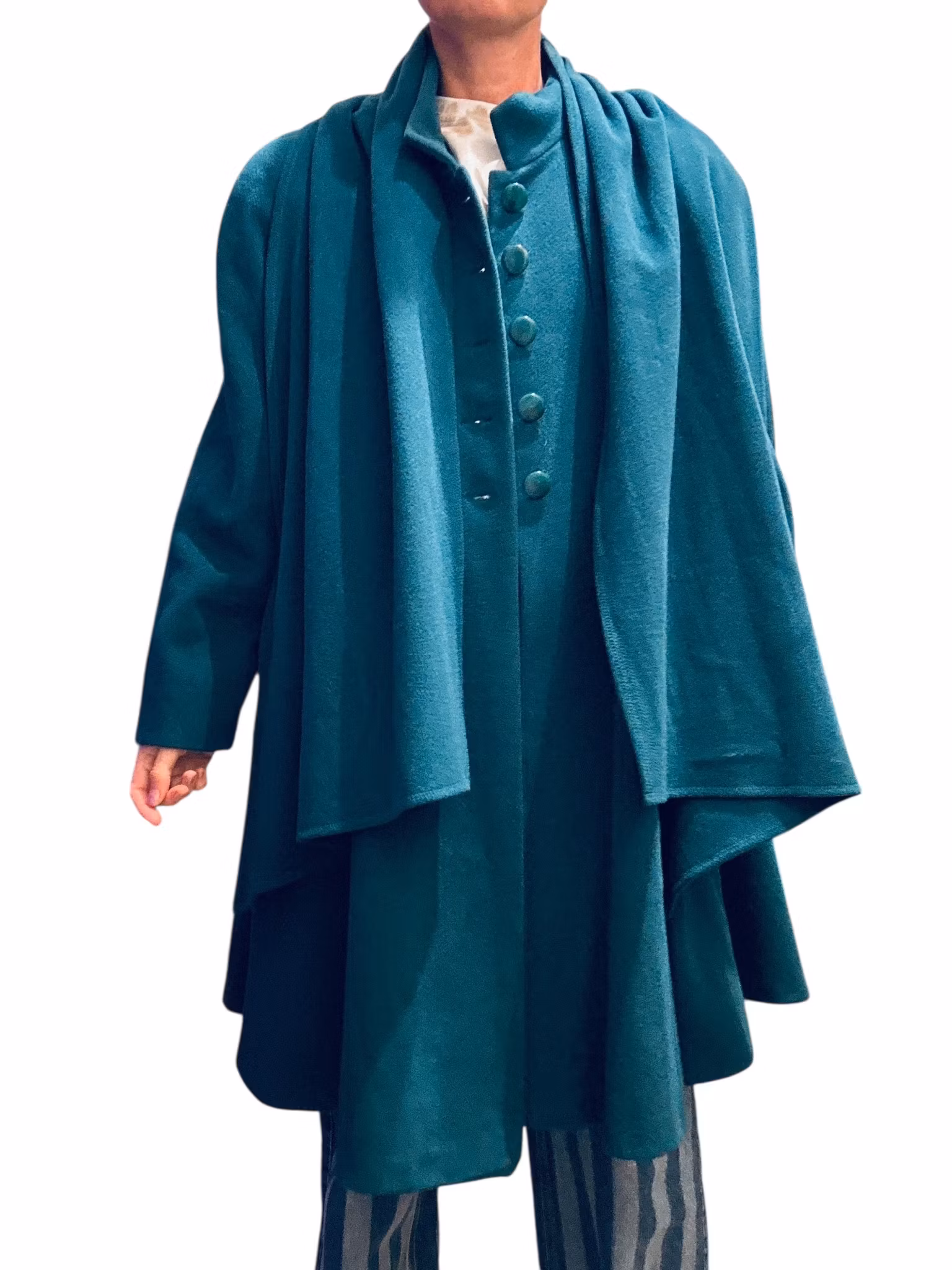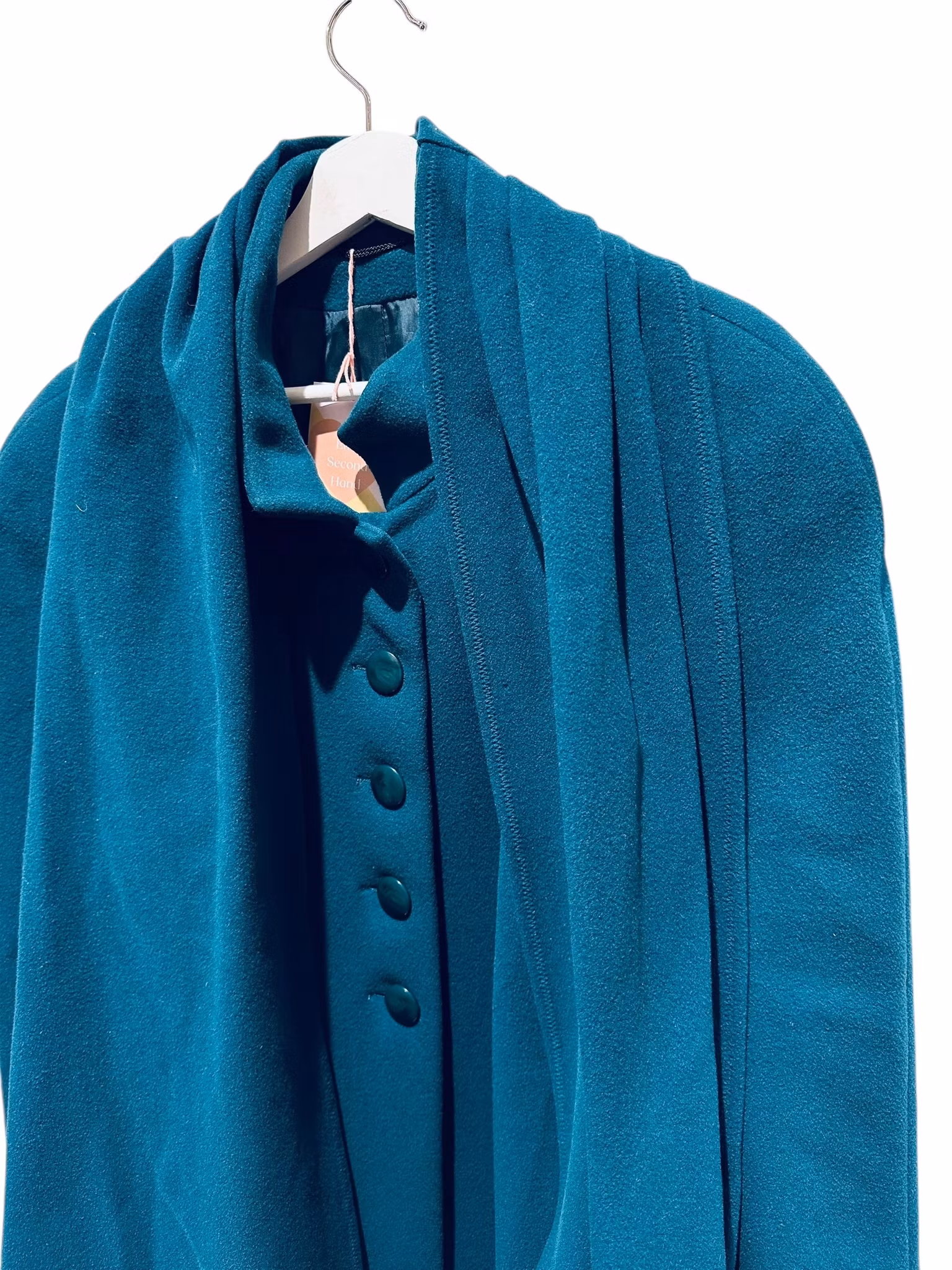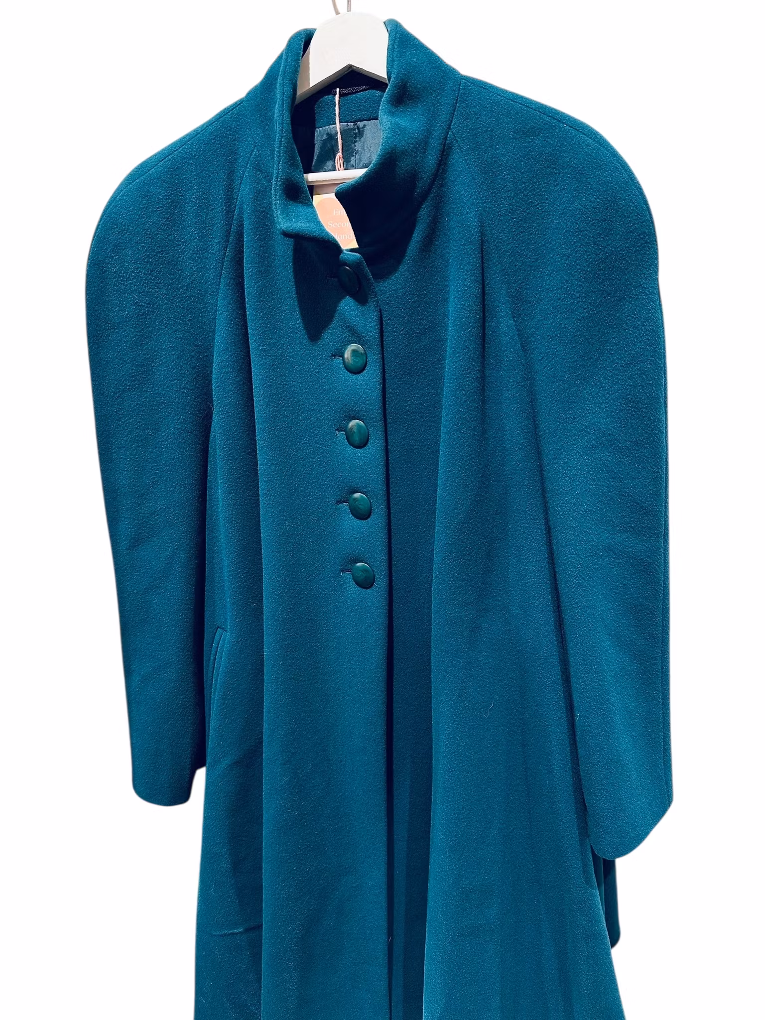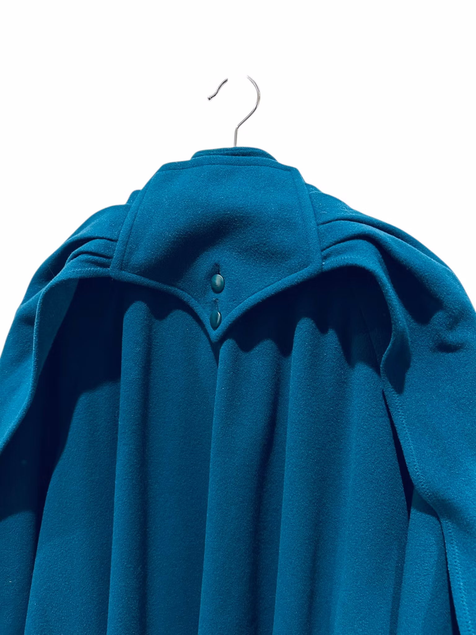 Beskrivning: En vintage österrikisk statement-kappa i mjuk, smaragdgrön ull (80%). Rejäla axlar och en snygg sjalkrage som fästs i ryggen med dekorativa knappar och vackra veck. Uppfattas som rymlig i storlek.