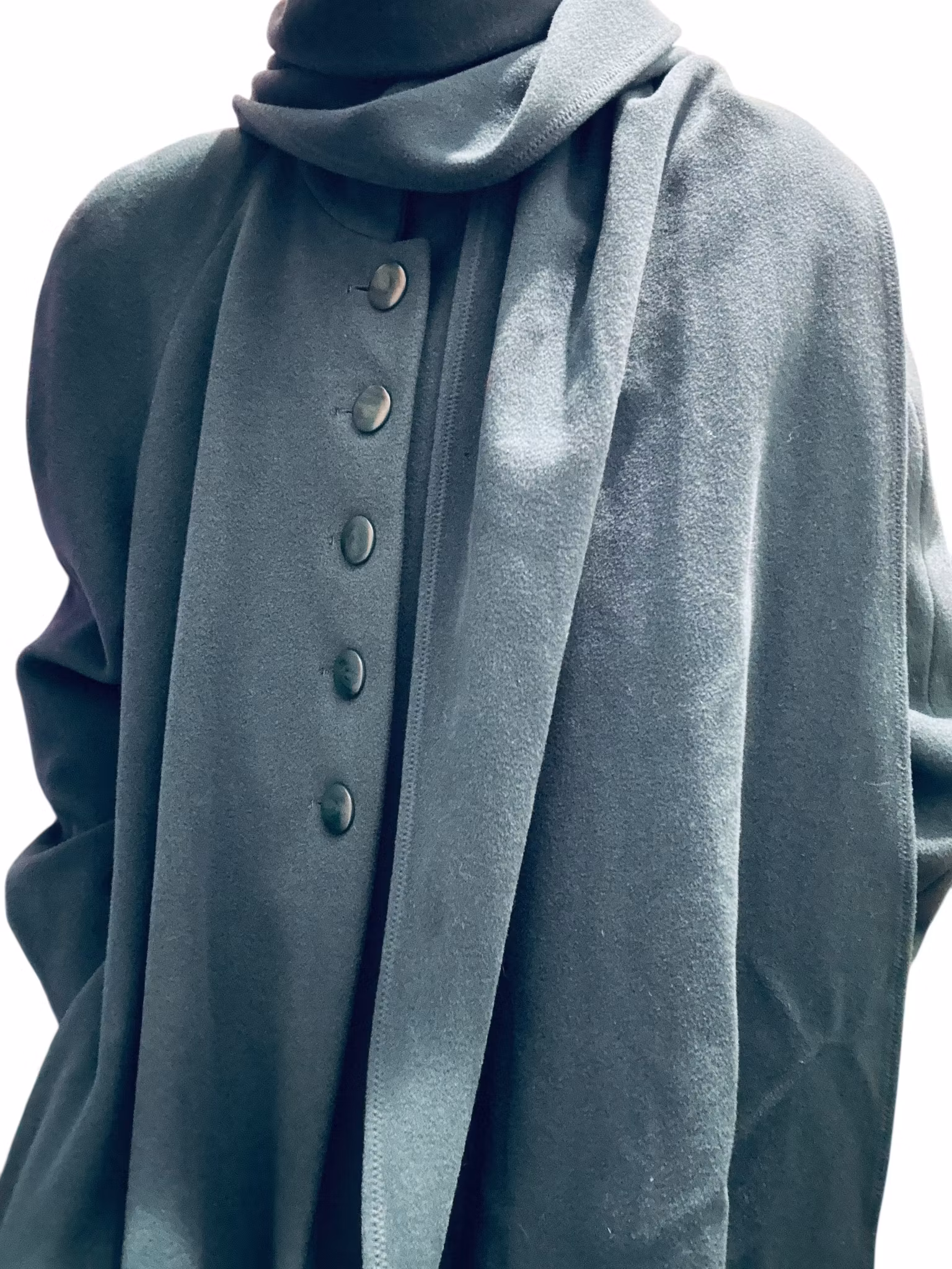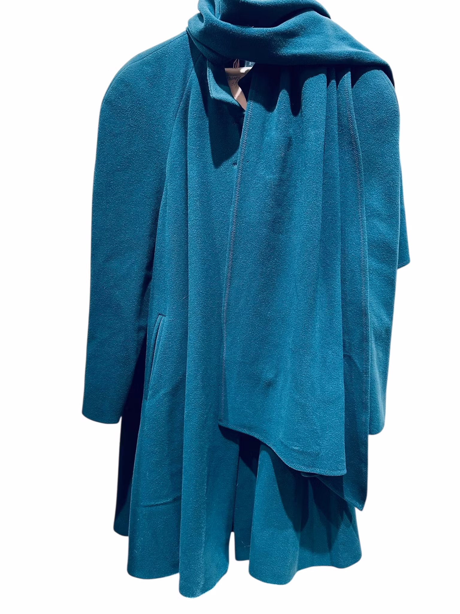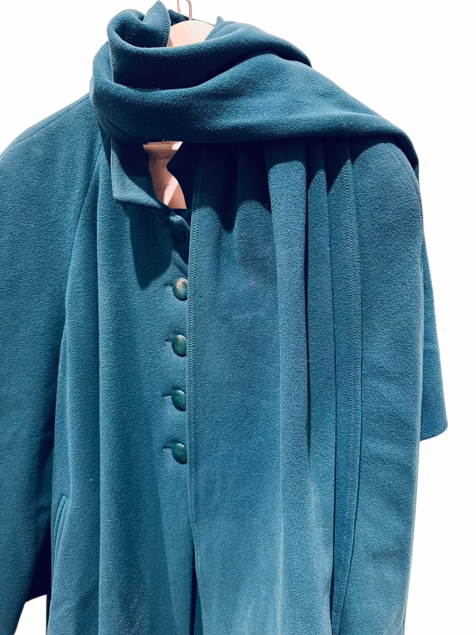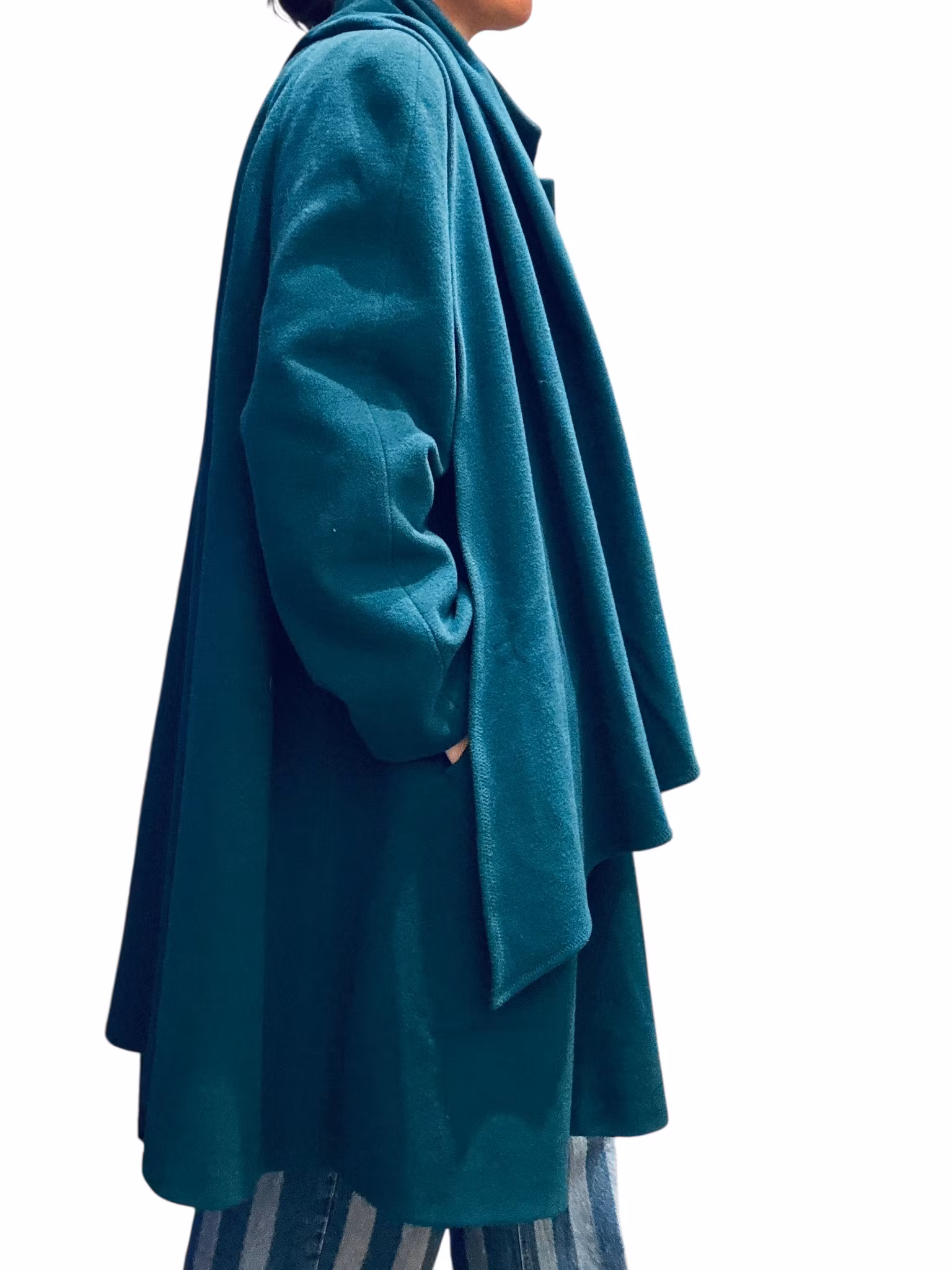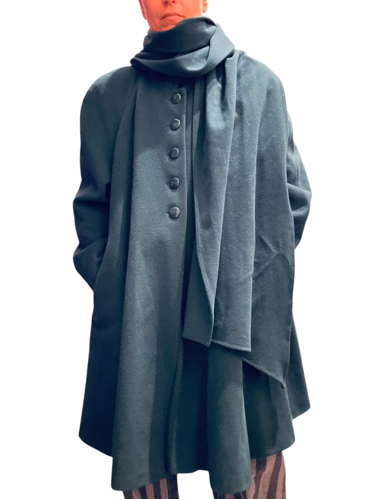 Beskrivning: En vintage österrikisk statement-kappa i mjuk, smaragdgrön ull (80%). Rejäla axlar och en snygg sjalkrage som fästs i ryggen med dekorativa knappar och vackra veck. Uppfattas som rymlig i storlek.