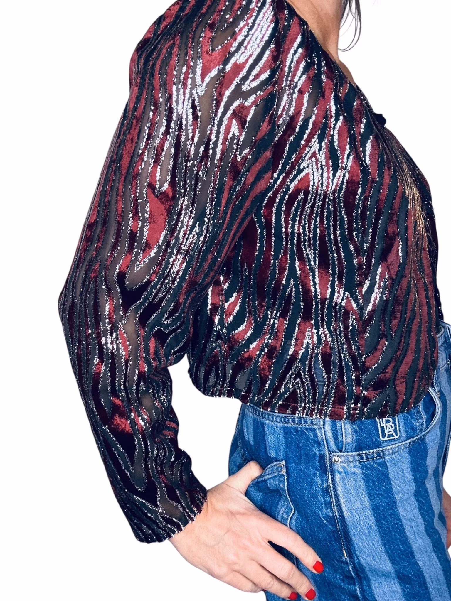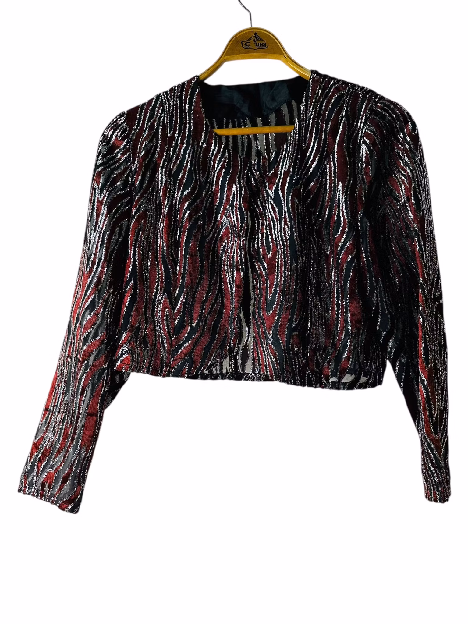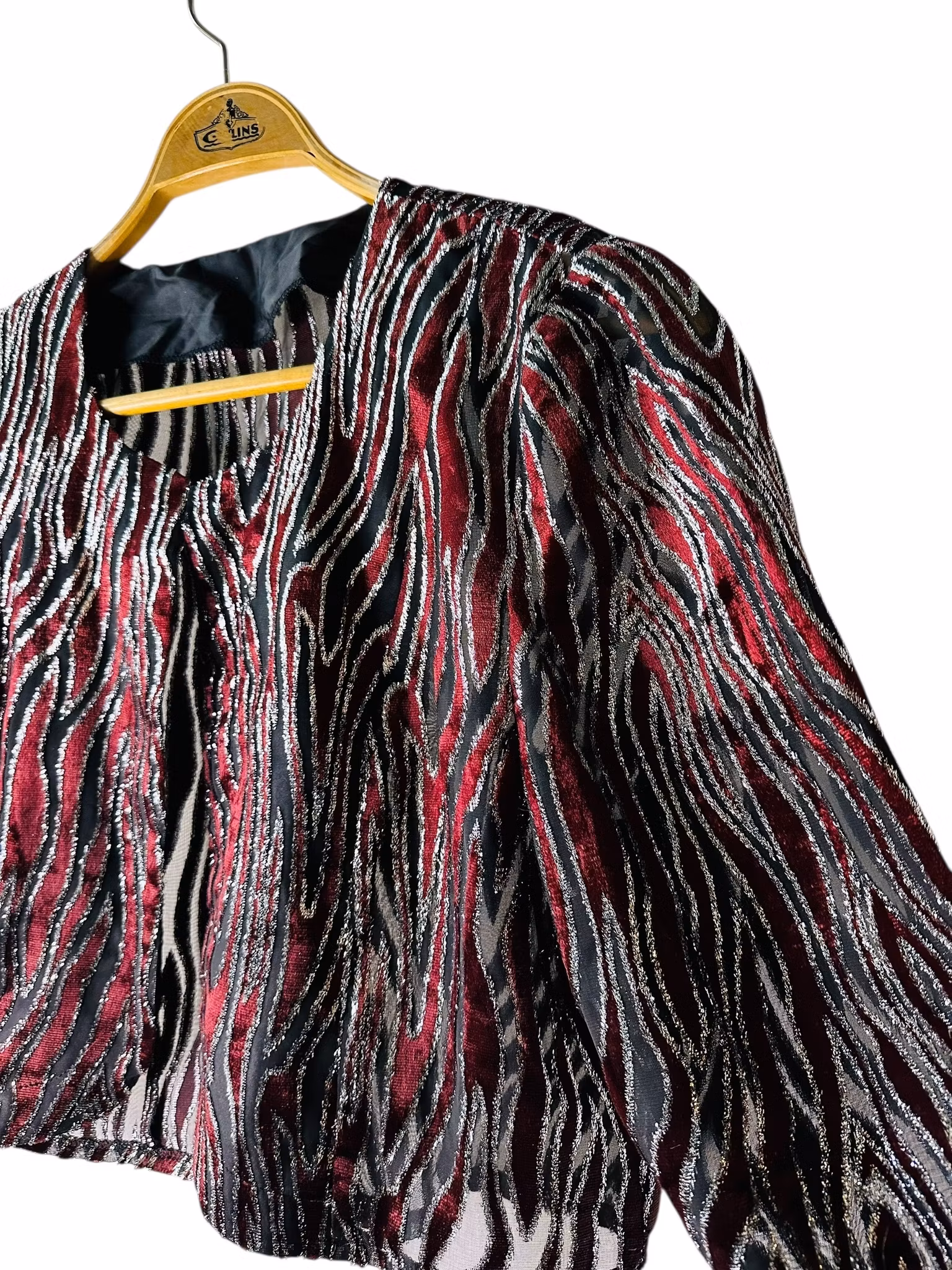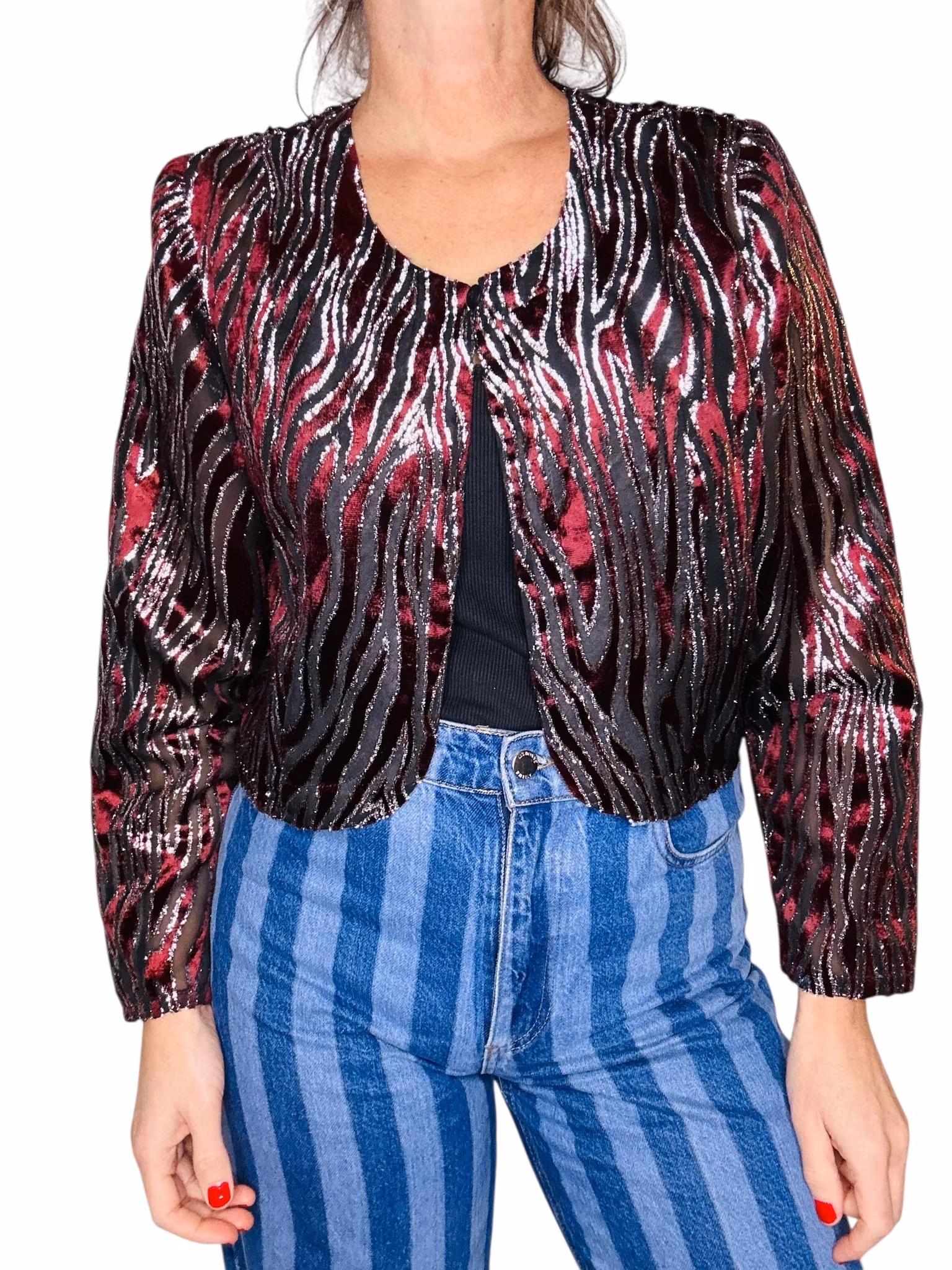 Beskrivning: Bolerojacka med zebramönster i vinrött, silver och svart. Det vinröda är sammetsliknande medan det svarta är lätt transparent. Så fin till fest och enkel att klä ner med jeans och tisha!